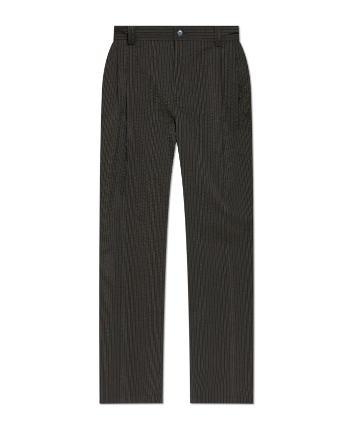 Представляем полосатые брюки от Maison Kitsunà, органично сочетающие элегантность и комфорт. Эти брюки изготовлены из легкой фактурной ткани, которая улучшает износостойкость и воздухопроницаемость, что делает их идеальными для повседневных прогулок. Ключевые особенности: Зеленый цвет | Сирсакер | Дышащая ткань | Застежка на пуговицы | Застежка на молнию | Вертикальный полосатый узор | Фирменная нашивка на заднем кармане | Размеры и посадка: Свободный, прямой крой |