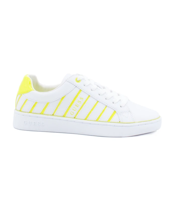 Кроссовки Guess - двухцветные кожаные кроссовки с лакированной кожей (Vernice) и неоновыми деталями. Шнуровка и резиновая подошва обеспечивают комфорт на каждый день и надежное сцепление. Ключевые особенности: Многоцветные | Bianco | Белые | Желтые | Кожа | Шнуровка | Текстильная подкладка | Резиновая подошва | Круглый носок | Двухцветный узор | Лакированная кожа (Vernice) и неоновые детали | Состав и уход: Верх: Кожа | Подкладка: Текстиль | Подошва: Резина