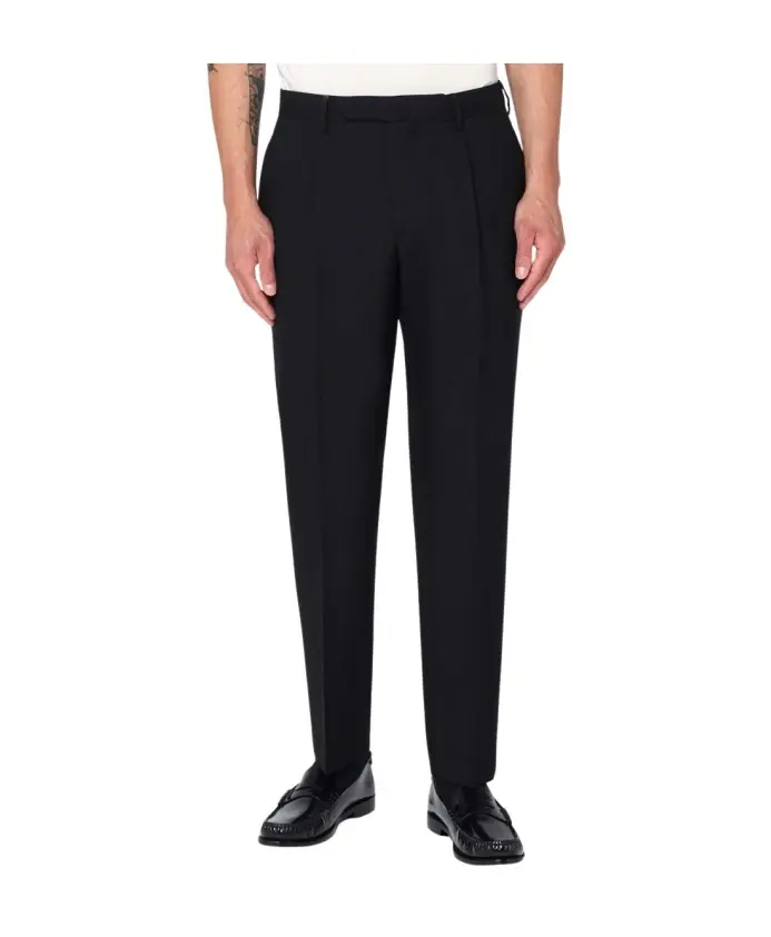 Брюки Santaniello Biagio от Santaniello - это классические шерстяные брюки, созданные для формального и делового гардероба. Они имеют складки спереди и классические детали пошива, что делает их подходящими для элегантных случаев. Ключевые особенности: Черный | Шерсть | Шлевки для ремня | Застежка на крючок и молнию | Боковые карманы | Задние прорезные карманы на пуговицах | Складки спереди | Классический силуэт | Прямые манжеты | Состав и уход: 100% шерсть