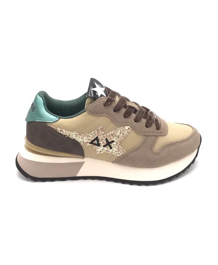 Пополните свою коллекцию кроссовок этими беговыми кроссовками Sun68 Stargirl с блестящим логотипом, выполненными из темно-бежевой ткани Crosta и технической ткани. Они имеют зеленые ламинированные кожаные накладки на пятке, бежевый язычок из технической ткани и вышитый логотип сбоку в виде золотой блестящей молнии. В комплекте бежевые бархатные шнурки, тканевая подкладка, мягкая съемная стелька из ткани и латекса, а также легкая двухцветная подошва из ЭВА.