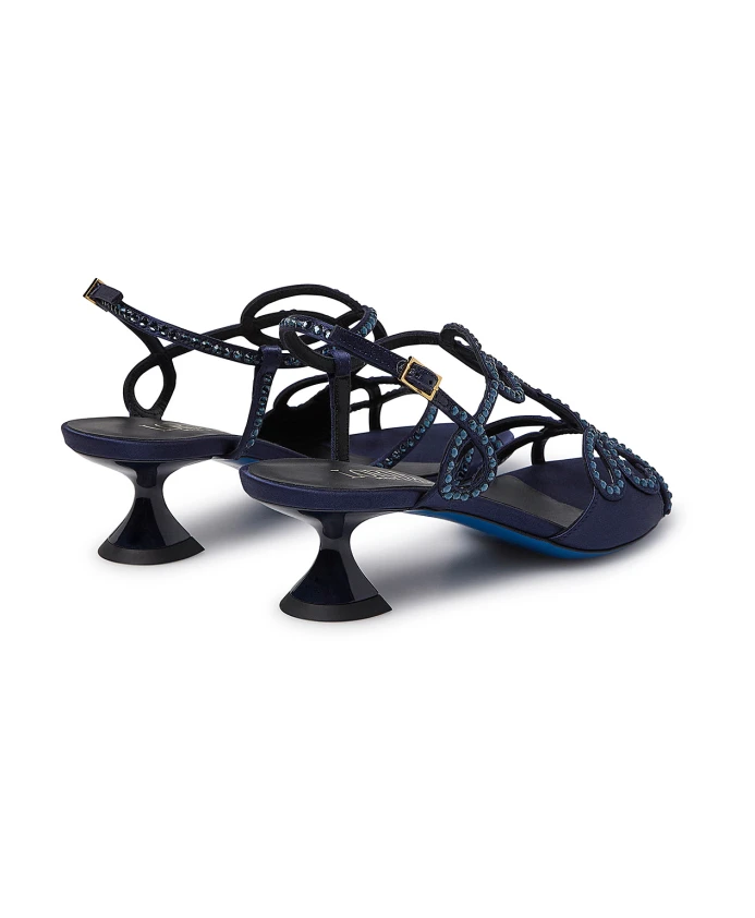 Новая интерпретация культовых сандалий Loriblu, украшенных драгоценными камнями. Эта версия из синего атласа украшена кристаллами в тон, искусно расположенными на плетеных ремешках, образующими скрипичный ключ, что отражает шикарный и утонченный стиль наших моделей. Благодаря расклешенному каблуку и фирменной синей подошве, эти сандалии - нестареющая классика, которая непременно станет центральным элементом ваших самых эксклюзивных образов в этом сезоне.