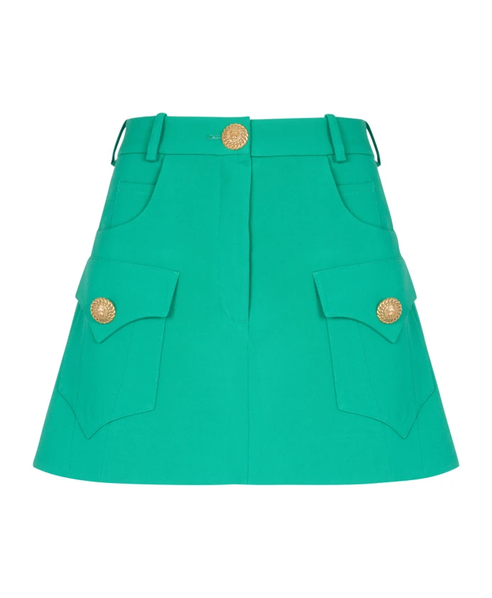 Трапециевидная юбка с вырезом в стиле вестерн. Две декоративные пуговицы золотистого цвета "Lion Signature" на передних карманах. Короткий, расклешенный крой. Потайная молния и пуговица золотистого цвета "Lion Signature". Рост модели 178 см, размер 36. Основной материал: 100% шерсть. Сделано в Словакии. Артикул: CF1LA359WC09. 100% шерстяных волокон в этом изделии получены с сертифицированных овцеводческих ферм, которые заботятся о благополучии животных.