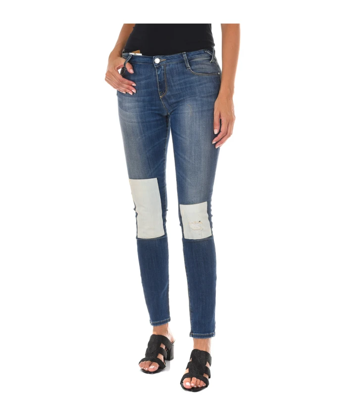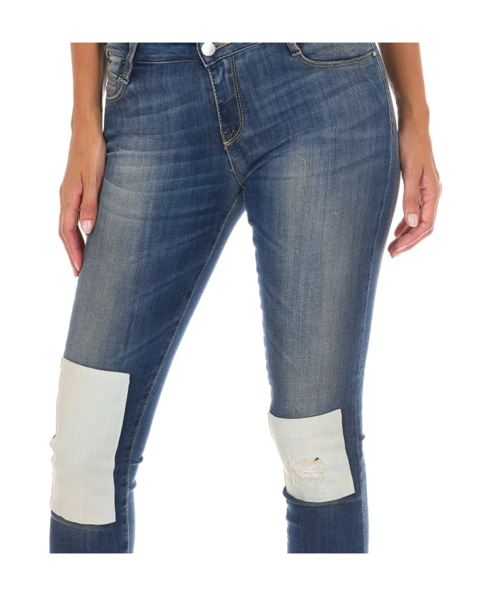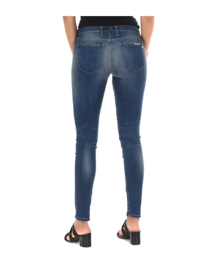 Женские узкие джинсы MET. Длинные джинсы с петлями для ремня. Застежка на пуговицу и молнию спереди. Два передних кармана и один небольшой карман. Два открытых задних кармана. Узкий крой с эффектом потертости и контрастными нашивками. Состав: 70% хлопок, 28% полиэстер, 2% эластан. Инструкции по уходу: Машинная стирка при температуре до 40°C. Гладить при средней температуре до 110°C. Сушить в сушильной машине. Не отбеливать. Не подвергать химчистке.