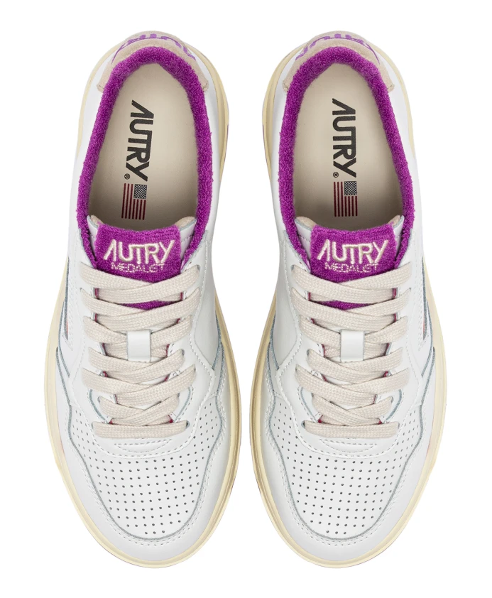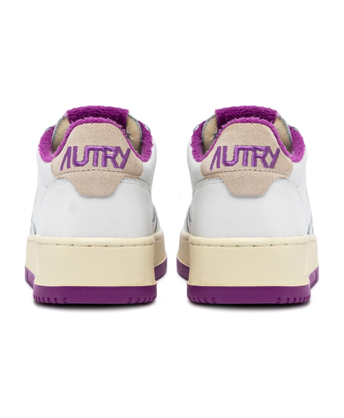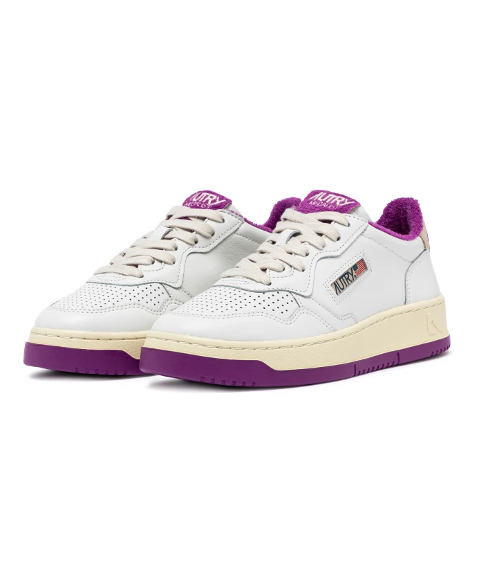 Подчеркните свой стиль с помощью этих белых низких кроссовок Autry 'Medalist' для женщин. Изготовлены из мягкой кожи с фиолетовыми вставками и бежевой замшевой задней частью с вышитым фиолетовым логотипом. Завершают образ культовые детали логотипа, круглый перфорированный носок и плоские хлопковые шнурки. Мягкий воротник вокруг щиколотки и резиновая подошва обеспечивают комфорт. Идеальное сочетание стиля и комфорта. Высота подошвы: 2,5 - 3,5 см.