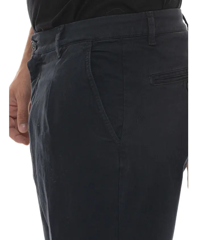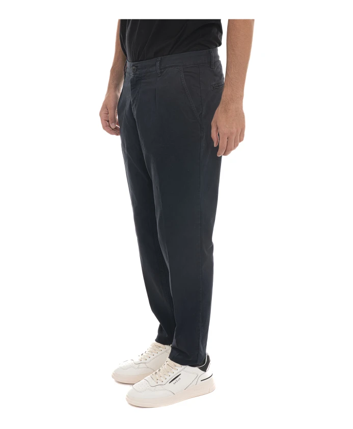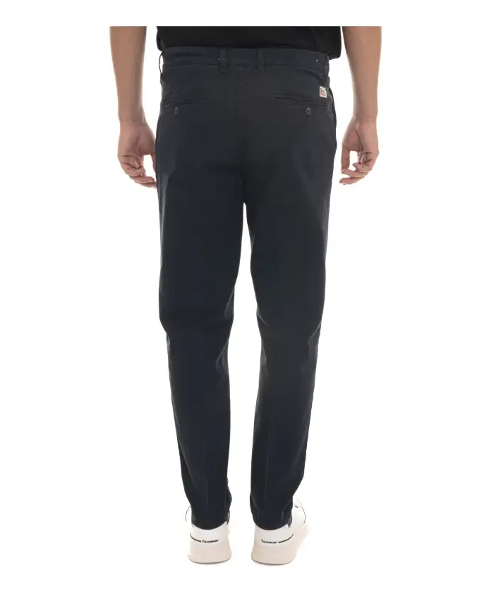 Брюки-чиносы Roy Roger из синего габардина с завышенной талией - универсальный фасон для повседневной носки, с добавлением эластичной ткани для комфорта. Ключевые особенности: Синий | Хлопок | Эластичная ткань | Шлевки для ремня | Застежка на молнию и пуговицу | Косые передние карманы | Прорезные задние карманы с застежкой на пуговицу | Завышенная талия | Габардиновое плетение | Пуговица с логотипом | Состав и уход: 97% хлопок, 3% эластан