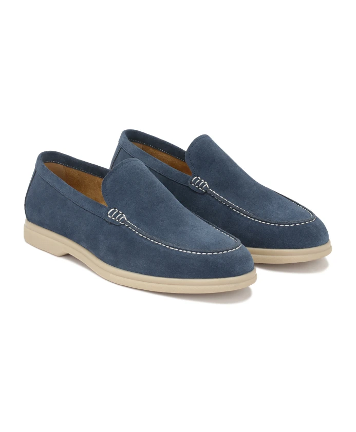 Мужские туфли-слипоны из синей замши - стильный выбор, сочетающий элегантность и комфорт. Верх, украшенный прострочкой на мыске, подчеркивает точность изготовления. Контрастная светлая подошва добавляет современный штрих, обеспечивая при этом комфорт и долговечность. Конструкция без шнурков делает их удобными в надевании и идеальным выбором для повседневной и полуформальной одежды. Подкладка из овчины гарантирует исключительный комфорт.