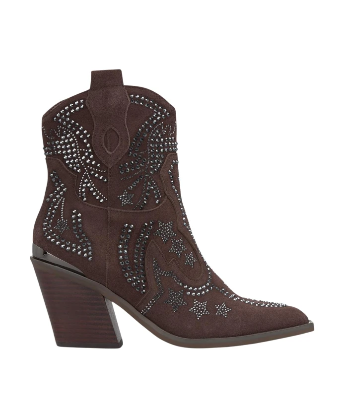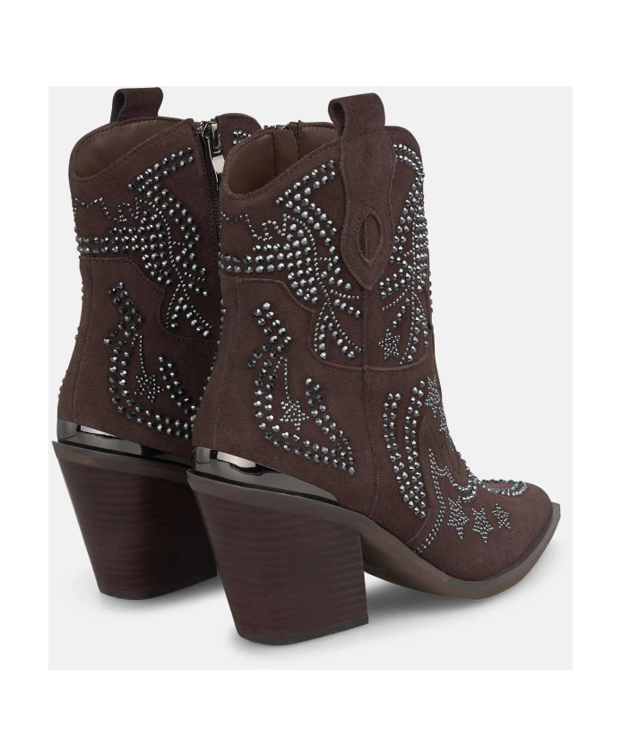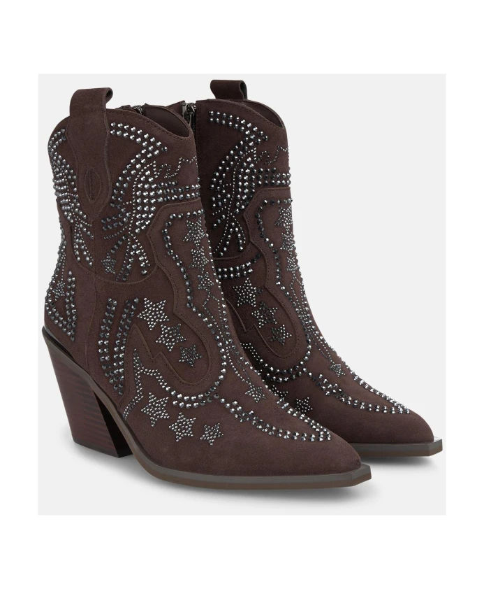 Ботильоны на каблуке ALMA EN PENA сочетают в себе детали в ковбойском стиле с заостренным носком и украшениями из страз. Застежка-молния сбоку позволяет легко надевать и снимать их, а устойчивый каблук обеспечивает элегантный вид как днем, так и вечером. Ключевые особенности: Коричневый | Застежка-молния | Заостренный носок | Украшения из страз | Силуэт ковбойских сапог | Размеры и посадка: Высота каблука: 8 см | Высота голенища: 18 см