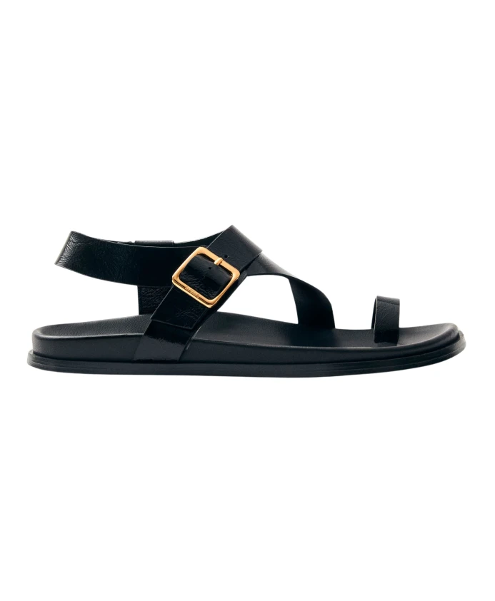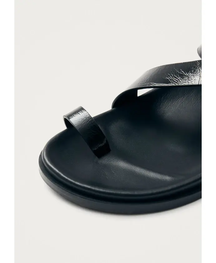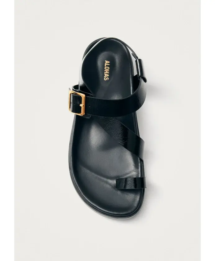 Черные лакированные сандалии-вьетнамки. Сандалии Siren имеют перемычку между пальцами и широкий ремешок, который обхватывает щиколотку и застегивается на золотую пряжку. Изготовленные из черной лакированной кожи, они оснащены формованными стельками, обеспечивающими комфорт и улучшенную поддержку в течение всего дня. Наша обувь соответствует стандартным размерам. Если вы находитесь между размерами, мы рекомендуем выбрать меньший размер.