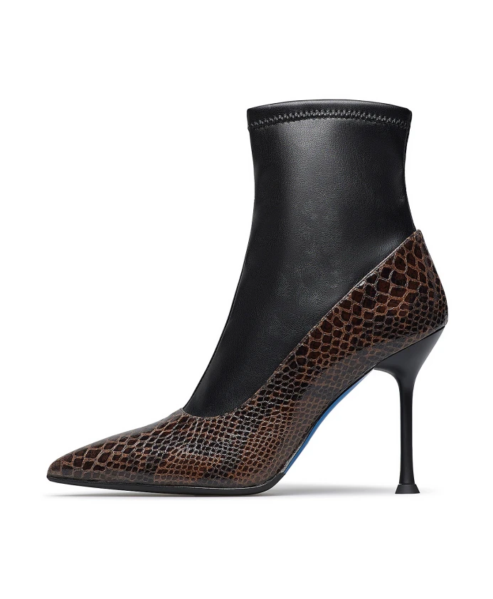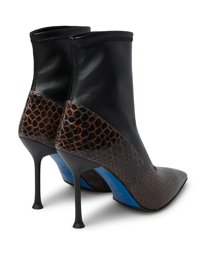 Ботильоны Loriblu с верхом из синтетического материала, имитирующего змеиную кожу, и контрастными черными эластичными вставками. Ботильоны на каблуке идеально подходят для элегантных повседневных и вечерних образов. Ключевые особенности: Разноцветный | Коричневый | Синтетический материал | Черные эластичные вставки | Высота до щиколотки | Верх с текстурой змеиной кожи | Каблук | Состав и уход: Синтетический материал | Эластичная ткань