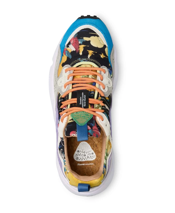 Спортивные кроссовки с хлопковым верхом, украшенным принтом «Дзен-сад» и разноцветными замшевыми вставками. Оснащены трекинговой шнуровкой и формованным боковым люверсом. Внутренняя часть отделана тканью и кожей, внутри - антибактериальная стелька из натуральной пробки. Сверхлегкая резиновая подошва имеет протектор и зубчатую поверхность. Кроссовки Flower Mountain обычно большемерят; рекомендуется заказывать на один размер меньше.