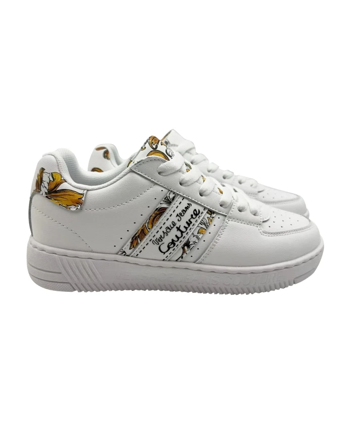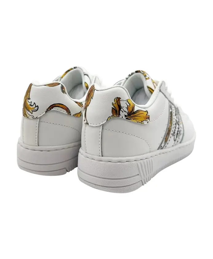Versace Jeans Couture представляет эти стильные кроссовки, которые добавят нотку роскоши в ваш повседневный гардероб. Изготовленные из гладкой коровьей кожи и украшенные оригинальным цветочным узором, эти кроссовки сочетают в себе комфорт и элегантность. Ключевые особенности: Белый цвет | Гладкая коровья кожа | Круглый носок с цветочным принтом | Низкие | Мягкая щиколотка | Состав и уход: 100% полиуретан | 100% телячья кожа