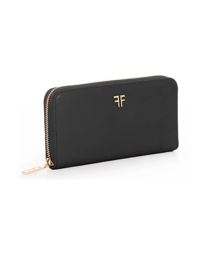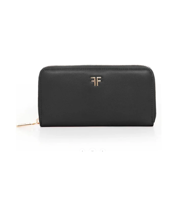 Женский кошелек Fracomina на молнии, изготовленный из черной искусственной кожи. Выполнен из черной искусственной кожи с металлизированной аппликацией в виде логотипа. Имеет застежку-молнию по всему периметру, подкладку из черной искусственной кожи, карман для монет на молнии, семь отделений для карт (одно прозрачное) и два внутренних кармана. Размеры: длина: 19,5 см, глубина: 2,5 см, высота: 10,5 см. Оригинальный продукт.