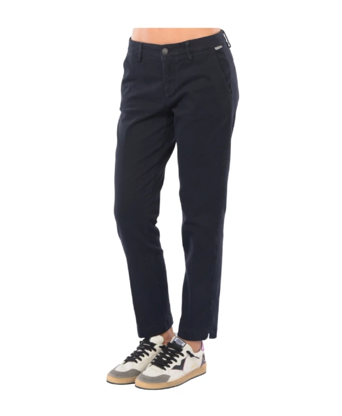 Обновите свой гардероб с помощью этих женских брюк-чинос от Roy Roger's. Изготовленные из эластичного хлопка и лиоцелла, эти брюки имеют застежку спереди на видимую пуговицу с логотипом контрастного цвета и потайную молнию, пояс с петлями для ремня, два наклонных передних кармана и два прорезных задних кармана, закрывающихся на видимую пуговицу с логотипом. Завершает образ тканевый логотип спереди и заутюженная складка.