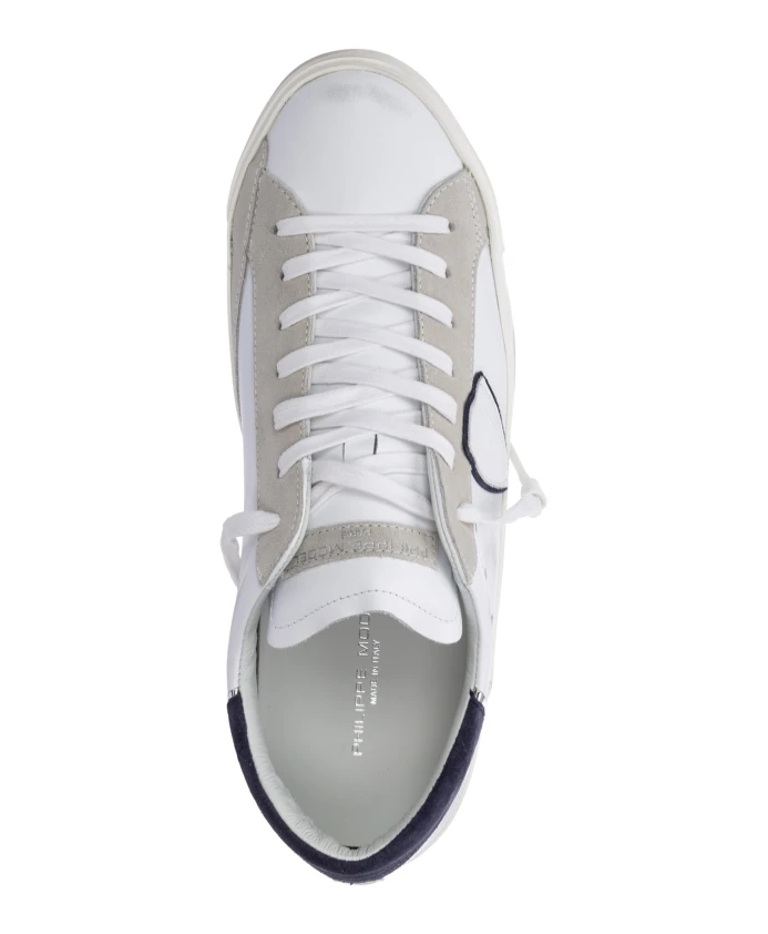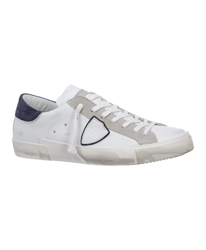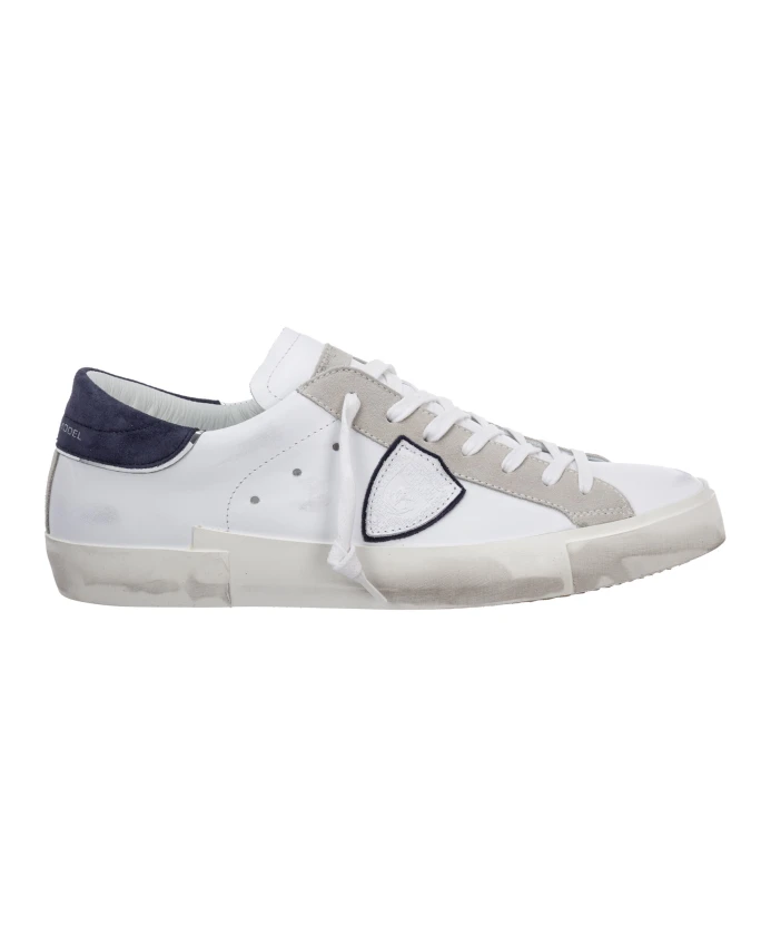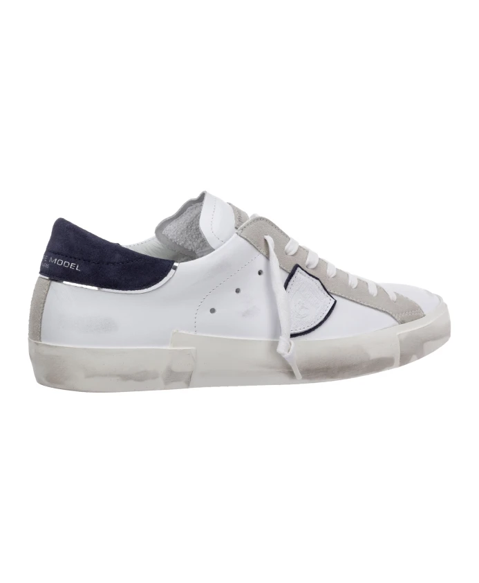 Подчеркните свой стиль с помощью этих белых низких кроссовок Philippe Model 'Prsx'. Изготовленные из сочетания телячьей кожи и замши, они имеют контрастную темно-синюю замшевую пятку с серебряным логотипом. Винтажный, потертый вид добавляет им характера. Дополнены резиновой подошвой, перфорированными боковыми панелями и серой замшевой вставкой сверху. Идеально подойдут для современного мужчины. Высота подошвы: 2,5 см.