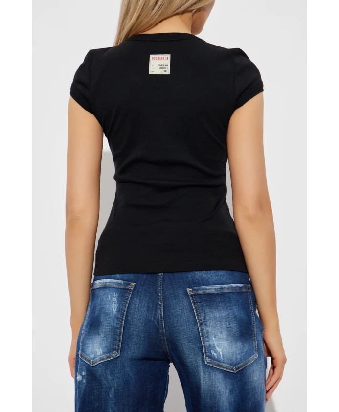 Эксклюзивная женская футболка от DSQUARED2 - это воплощение чувственной простоты в престижном издании. Приталенный крой подчеркивает силуэт, а мягкий, гладкий хлопок облегает тело, как вторая кожа. Глубокий черный цвет прекрасно гармонирует с эффектной белой надписью в верхней левой части груди, выполненной в стиле художественной аэрозольной краски. На верхней части спины расположена незаметная нашивка с логотипом.