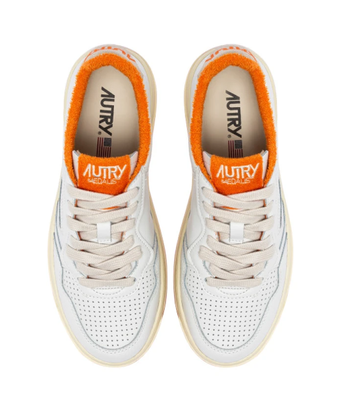 Подчеркните свой стиль с помощью этих белых низких кроссовок Autry 'Medalist' для женщин. Изготовлены из мягкой кожи с яркими оранжевыми деталями из вспененного материала и бежевой замшевой задней частью. Украшены вышитыми логотипами, культовыми деталями и мягким воротником вокруг щиколотки для комфорта в течение всего дня. Идеально подходят для повседневного, но стильного образа. Высота подошвы: 2,5 - 3,5 см.
