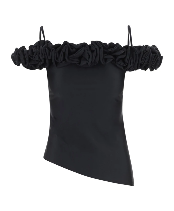 Представляем топ Coperni из эластичного трикотажа с рюшами - стильный черный топ, созданный для элегантности и комфорта. Этот топ отличается уникальным дизайном с рюшами, идеально подходящим для придания изысканности любому образу. Ключевые особенности: Черный | Трикотаж | Прямой вырез | Тонкие бретели | Рюши | Асимметричный низ | Размеры и посадка: Приталенный крой | Состав и уход: 80% полиамид | 20% эластан