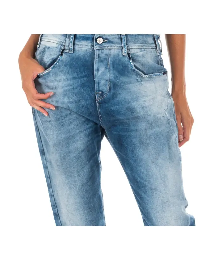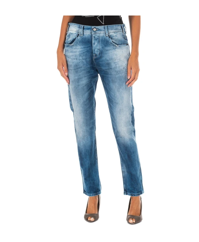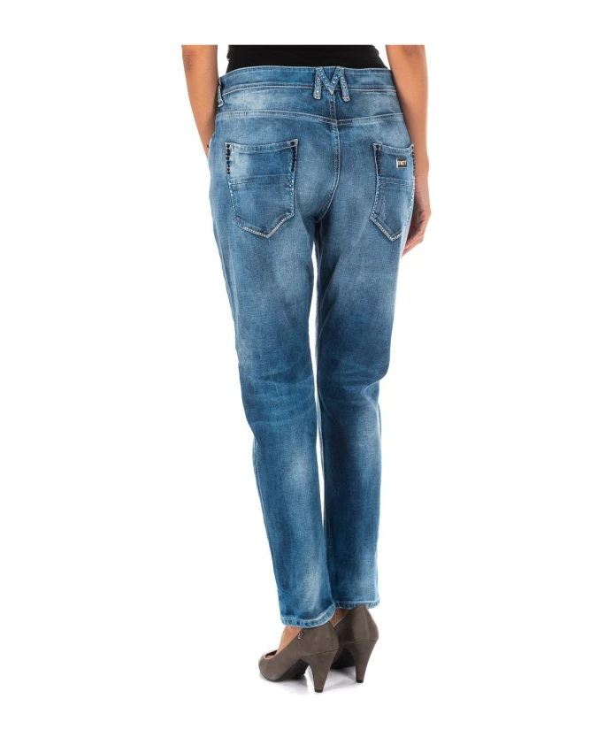Длинные джинсы из денима от MET для женщин. Имеют петли для ремня, застежку на пуговицу, два передних кармана и два задних кармана с металлическим логотипом. Прямой низ с эффектом потертости. Видимые швы в тон. Состав: 98% хлопок, 2% эластан. Инструкции по уходу: машинная стирка при температуре до 40°C, глажка при средней температуре до 110°C, сушка в сушильной машине, не отбеливать, не подвергать химчистке.