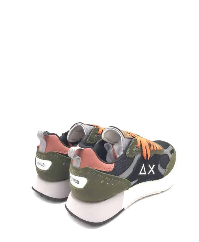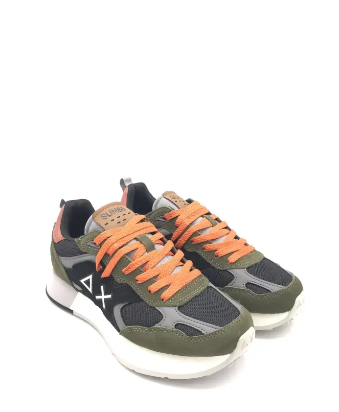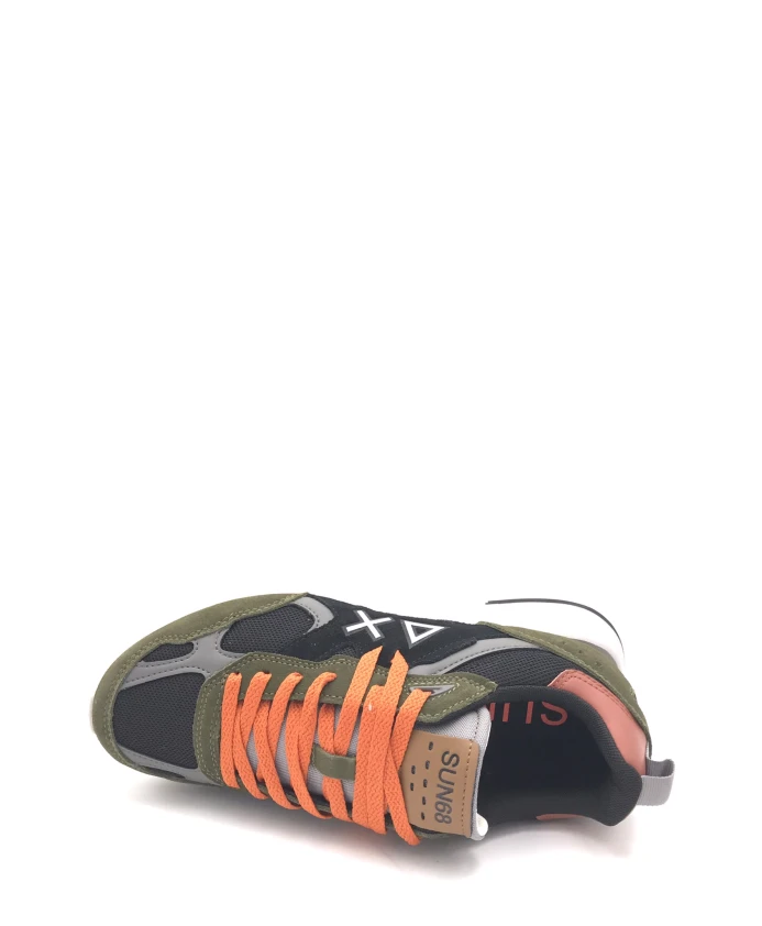 Мужские кроссовки Sun68, идеально подходящие для бега на открытом воздухе. Изготовлены из темно-зеленой замши и черной технической ткани с кожаными накладками кирпичного цвета на пятке. Имеют черные замшевые детали, серый нейлоновый язычок и большой логотип сбоку. В комплекте оранжевые и черные шнурки. Тканевая подкладка, мягкая съемная тканевая и латексная стелька. Легкая двухцветная подошва из ЭВА.