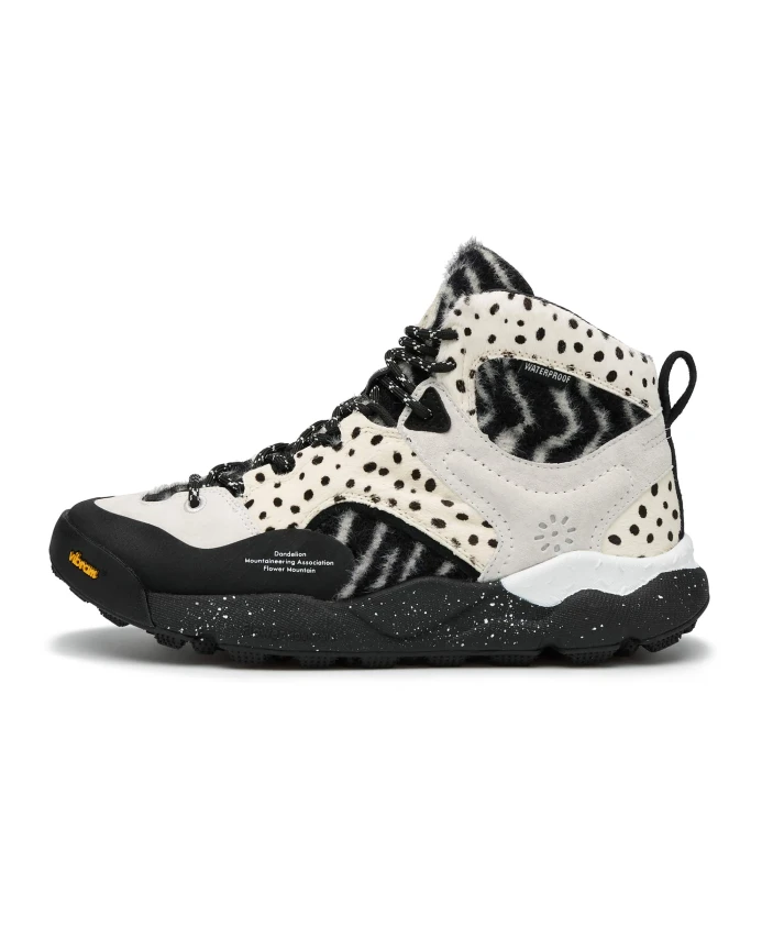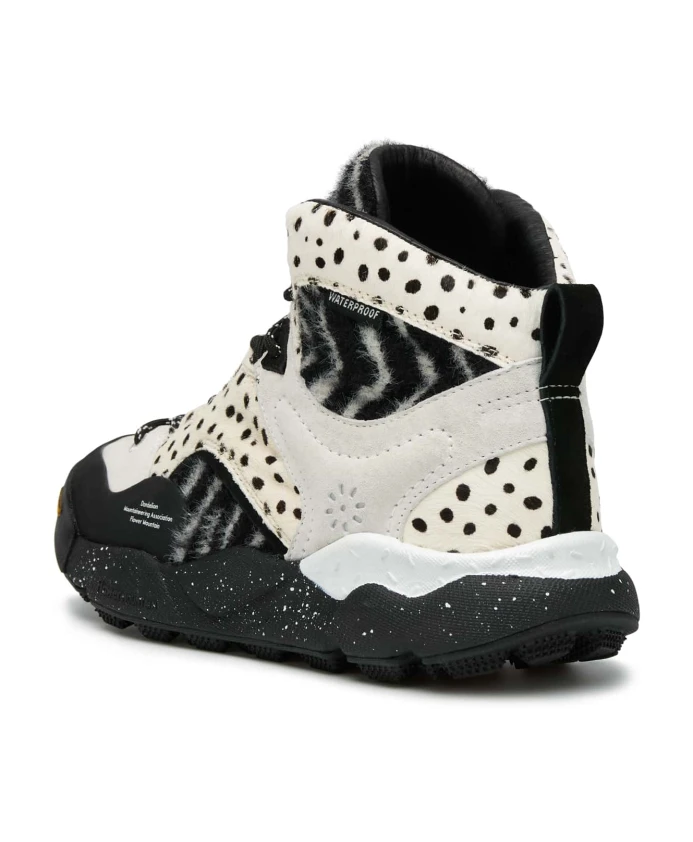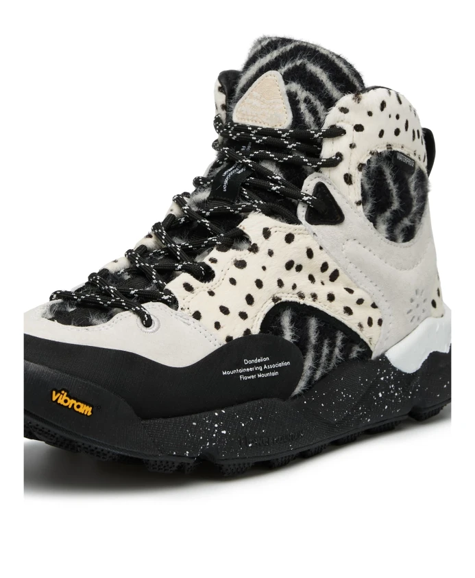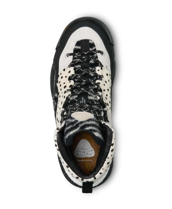 Высокие кроссовки в дизайне, вдохновленном стилем активного отдыха, с верхом из замши и технической ткани с меховой отделкой и контрастным черно-белым анималистическим принтом. Шнурки в треккинговом стиле и рифленая микропористая резиновая подошва дополняют образ. Съемная антибактериальная пробковая стелька. Обувь Flower Mountain обычно большемерит; рекомендуется заказывать на один размер меньше.
