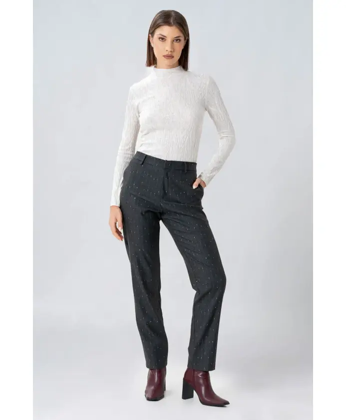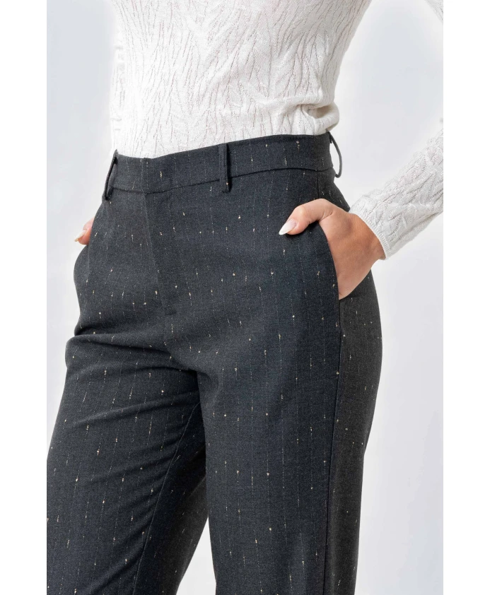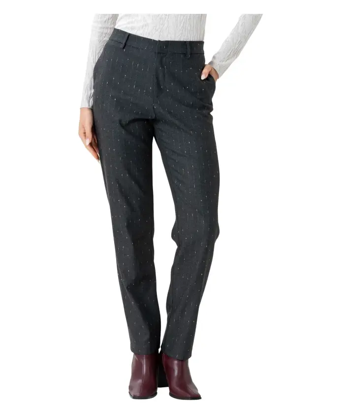 Стильные, блестящие расклешенные брюки от Kocca добавят изысканности как деловым, так и вечерним образам. Они сочетают тонкие полоски с блестящими акцентами, создавая элегантный силуэт, подходящий для офиса. Основные характеристики: Серый | Темно-серый | Скрытая застежка на молнию и крючок | Тонкие полоски | Блестящие акценты | Приталенный пояс | Размеры и посадка: Узкий крой | Расклешенные брюки