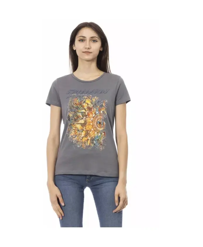 Футболка Trussardi Action сочетает в себе яркий принт спереди и классический круглый вырез, что делает ее удобной повседневной вещью. Смесь хлопка и вискозы обеспечивает комфорт и долговечность, а также хорошо сочетается с джинсами или юбками. Основные характеристики: Серый | Хлопок | Комфортный | Долговечный | Круглый вырез | Короткие рукава | Принт спереди | Состав и уход: Хлопок | Вискоза