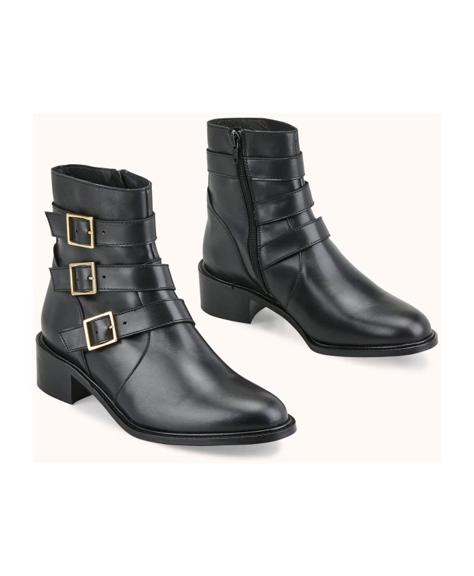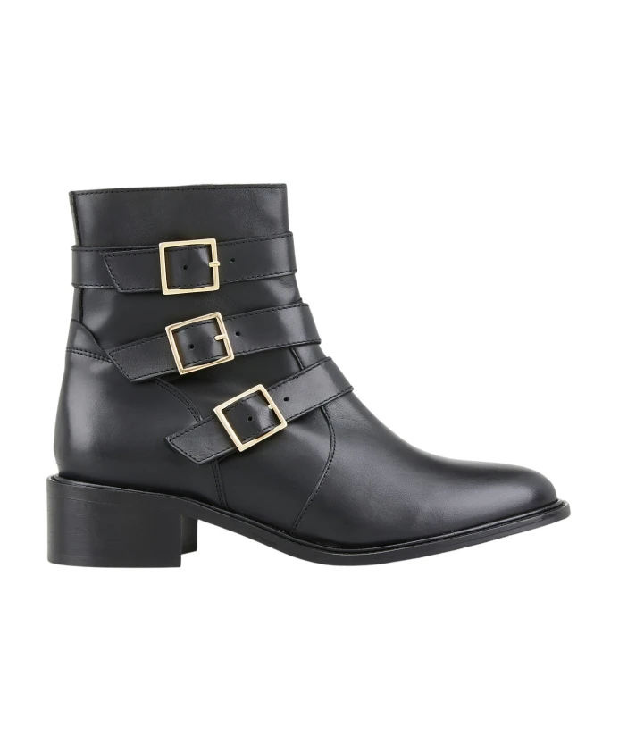 VILNA - это ботильоны на каблуке 3 см. Они украшены тремя ремешками и изящными квадратными золотыми пряжками. Доступны в гладкой черной коже или замше цвета коньяка. Их женственный, но в то же время дерзкий вид делает их обязательным элементом гардероба в этом сезоне. Эта модель изготовлена из кожи, полученной от кожевенных заводов, сертифицированных Leather Working Group как «Золотые».