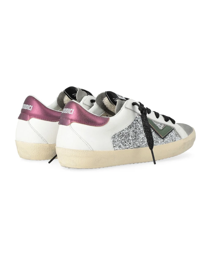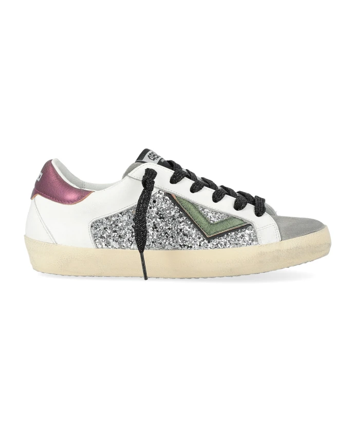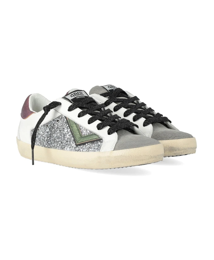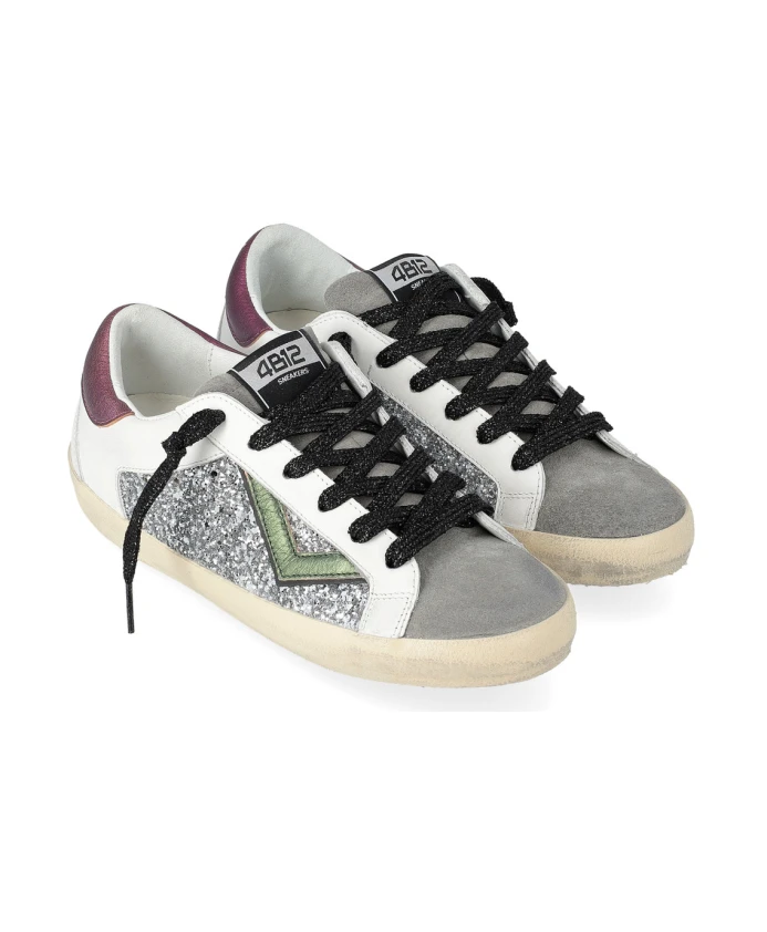 Подчеркните свой стиль с помощью модели 4B12 Suprime из белой кожи с серебряными стразами и серыми замшевыми деталями. Она имеет верх из розовой ламинированной кожи с напечатанным логотипом, зеленую кожаную надпись сбоку и потертую подошву. Верх из розовой ламинированной кожи, зеленая кожаная надпись сбоку, логотип бренда на язычке, резиновая подошва, кожаная подкладка, кожаная стелька.