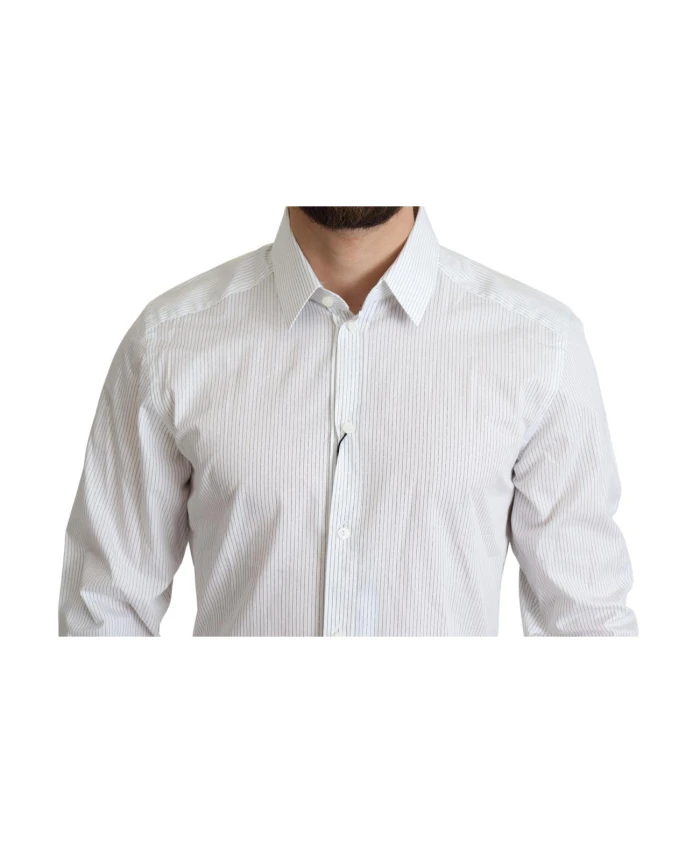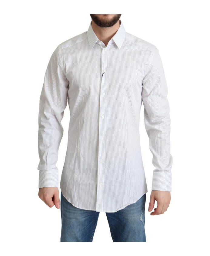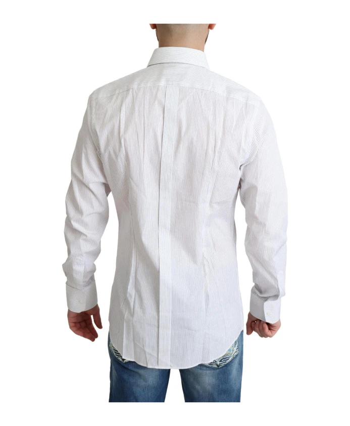 Подчеркните свой стиль с помощью этой потрясающей мужской рубашки Dolce & Gabbana GOLD. Изготовленная в Италии из 100% хлопка, эта аутентичная рубашка имеет полоски, отложной воротник, длинные рукава и приталенный крой для современного образа. Белый цвет и едва заметные детали логотипа добавляют элегантности любому наряду. Доверьтесь безупречному мастерству и качеству Dolce & Gabbana.