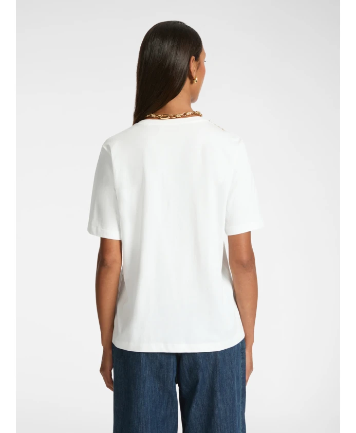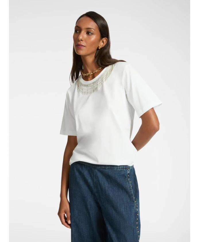 Описание товара: - Хлопковая футболка свободного кроя с вышивкой в виде ожерелья на вырезе горловины, металлической микробахромой и стразами. - Свободный крой обеспечивает непринужденный и современный стиль. - Короткие рукава. Состав и уход: - Основная ткань: 100% хлопок. - Ручная стирка; не сушить в сушильной машине; не отбеливать; не подвергать химчистке; не гладить (макс. 110°C).