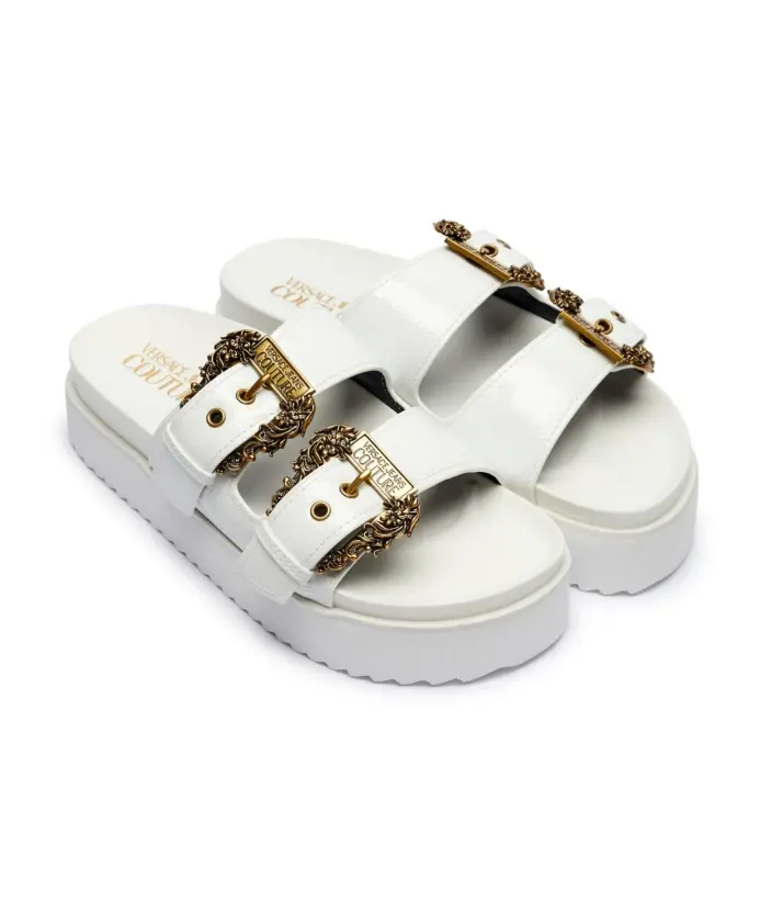 Versace Jeans Couture представляет эти стильные белые сандалии, идеально подходящие для повседневных прогулок благодаря элегантному дизайну и удобной посадке. Ключевые особенности: Белый цвет | Резина | Без застежек | Двойной ремешок с пряжками | Открытый носок | Круглый носок | Гравированный логотип | Размер и посадка: Стандартная | Состав и уход: Резина | Протирать влажной тканью.