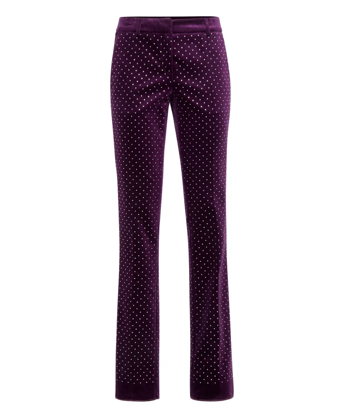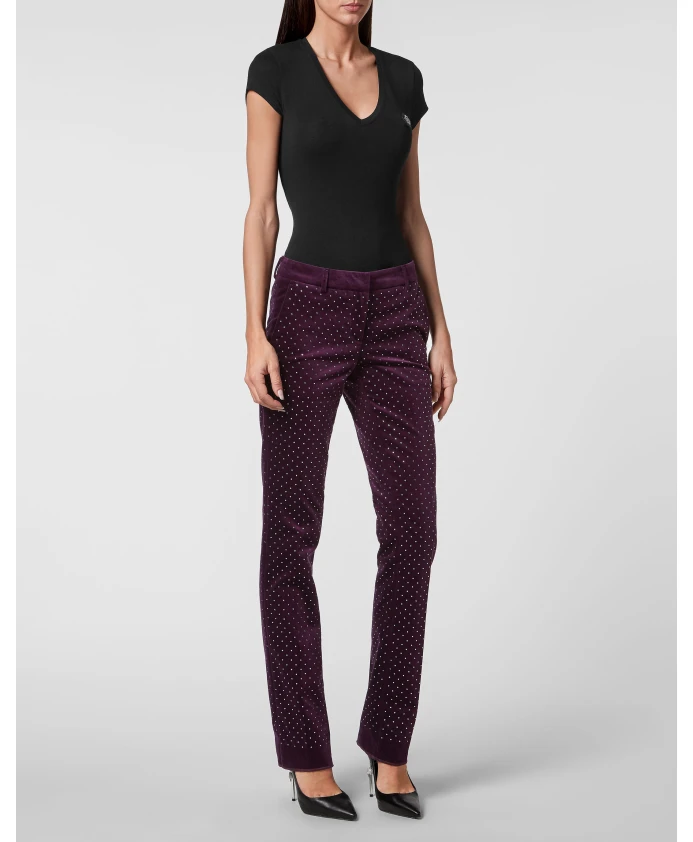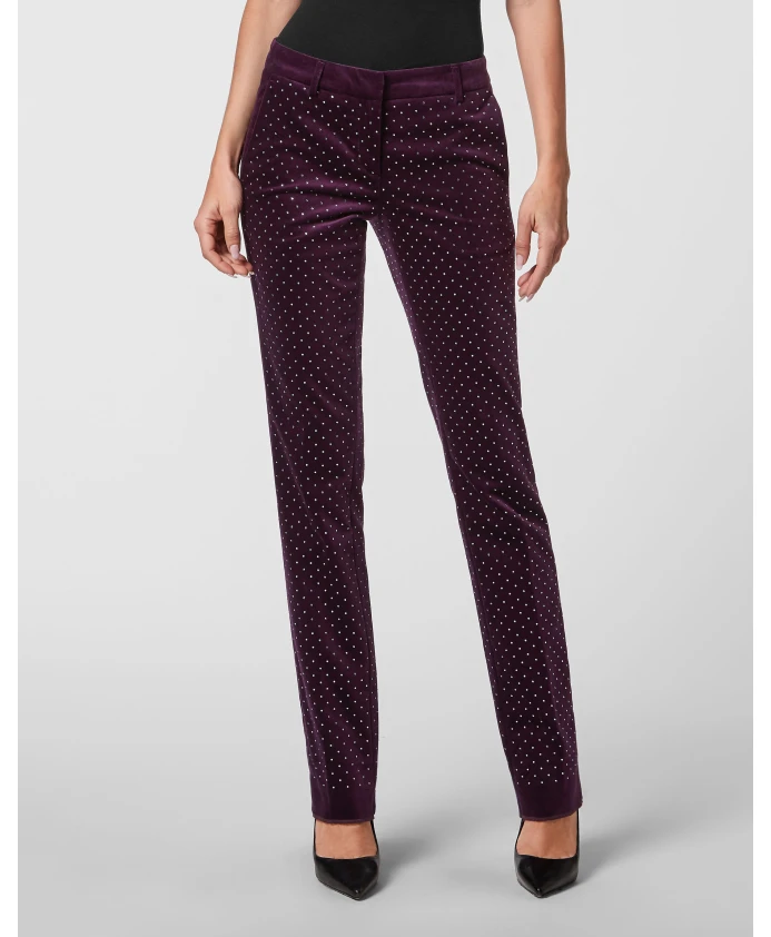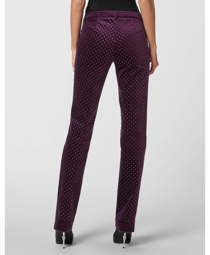 Прямые брюки Philipp Plein из хлопкового бархата, украшенные стразами, создадут гламурный образ как для дневного, так и для вечернего выхода. Ключевые особенности: Фиолетовый | Хлопковый бархат | Скрытая застежка на пуговицы на поясе | Два прорезных кармана | Украшение стразами | Бархатная текстура | Прямой крой | Размеры и посадка: Прямой крой | Состав и уход: Хлопковый бархат