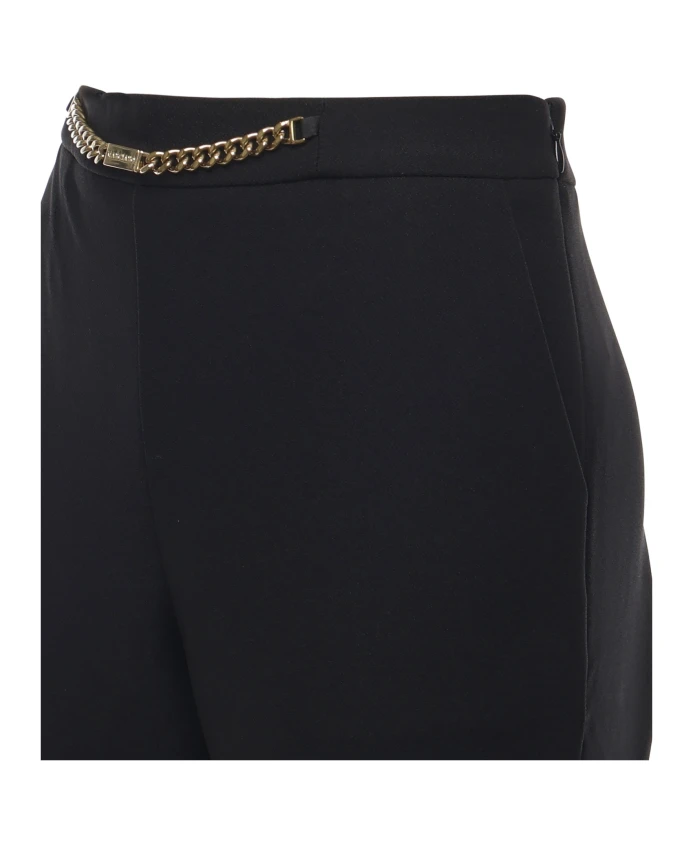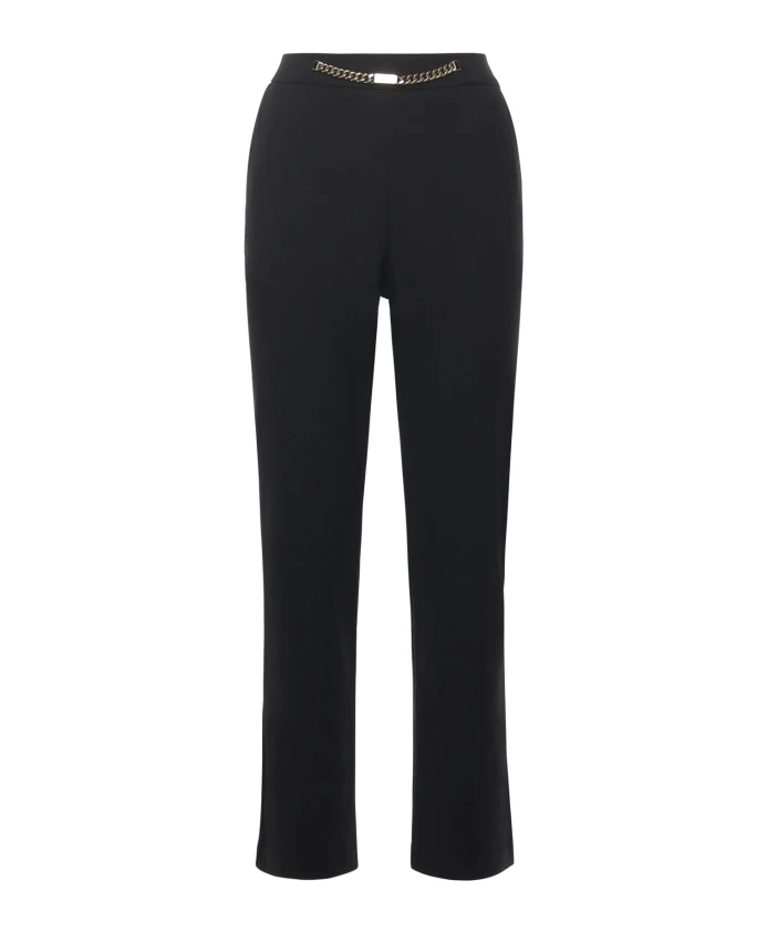 Широкие брюки Guess из черной эластичной ткани. Они имеют декоративную цепочку на талии, косые карманы и застежку-молнию сзади, создавая узкий силуэт с широкими штанинами. Ключевые особенности: Черный цвет | Эластичная ткань | Косые карманы | Застежка-молния сзади | Декоративная цепочка на талии | Широкие штанины | Размеры и посадка: Широкий крой | На фото представлен размер 42