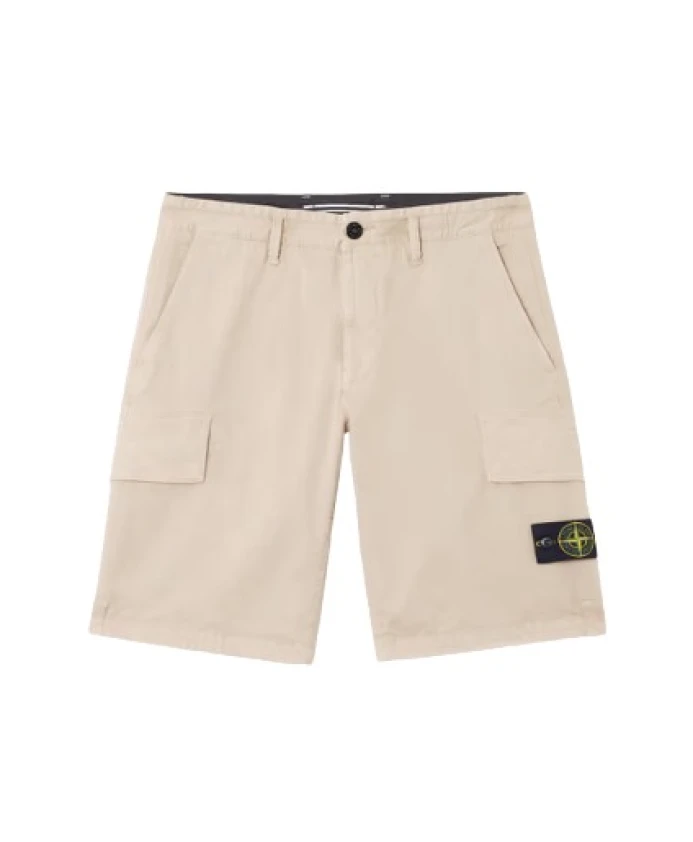 Бермуды Stone Island цвета «голубиный серый» из эластичной саржи с эффектом потертости, окрашенные по технологии «OLD» для создания слегка поношенного вида. Узкий крой, наклонные карманы, задний карман со скрытой застежкой на кнопку и набедренный карман с логотипом Stone Island. Застежка на молнию и пуговицу. Состав: 97% хлопок, 3% эластан. Машинная стирка. Сделано в Румынии.
