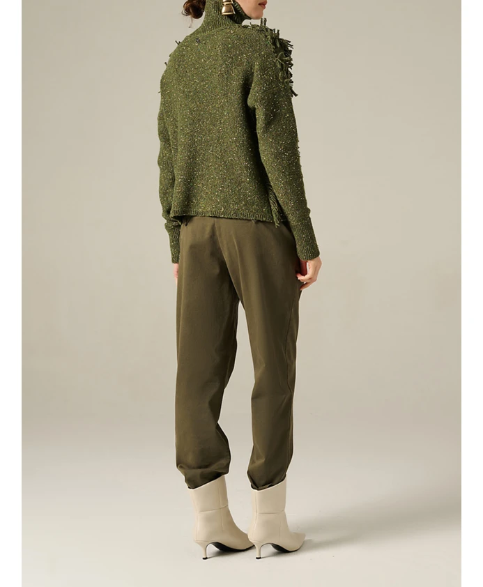 Брюки-чинос Manila Grace сочетают в себе лаконичный, женственный вид и практичность. Они имеют передние вытачки и свободный силуэт, идеально подходящий для комфортной офисной или современной одежды. Ключевые особенности: Зеленый | Военный стиль | Передние вытачки | Стиль чинос | Лаконичный, женственный силуэт | Размеры и посадка: Свободный крой | Рост модели 180 см, размер 40