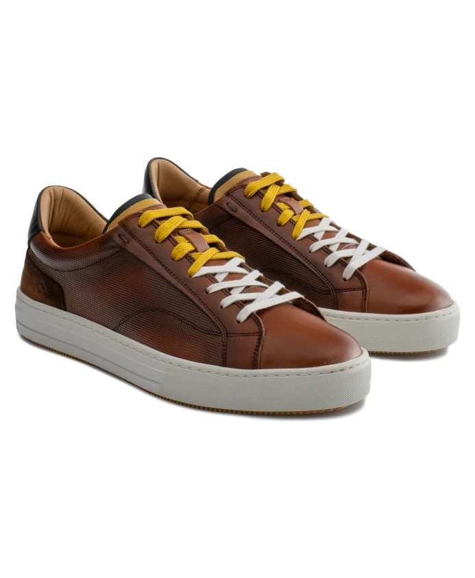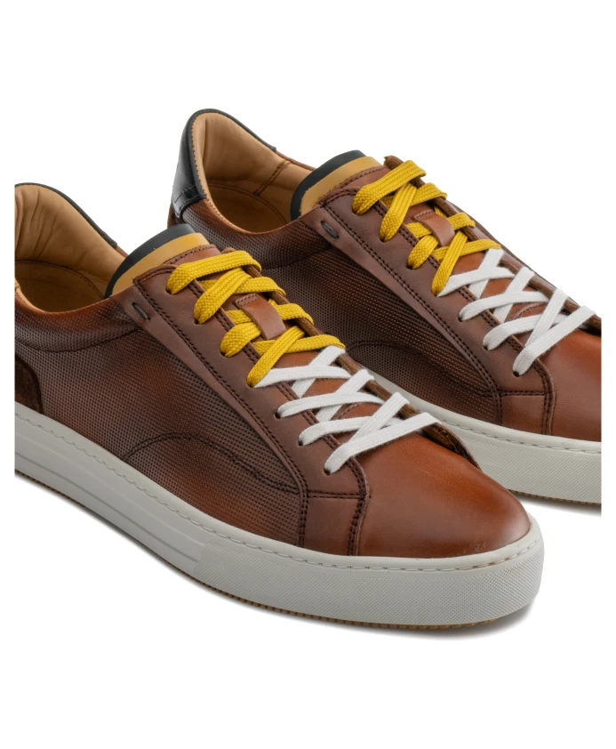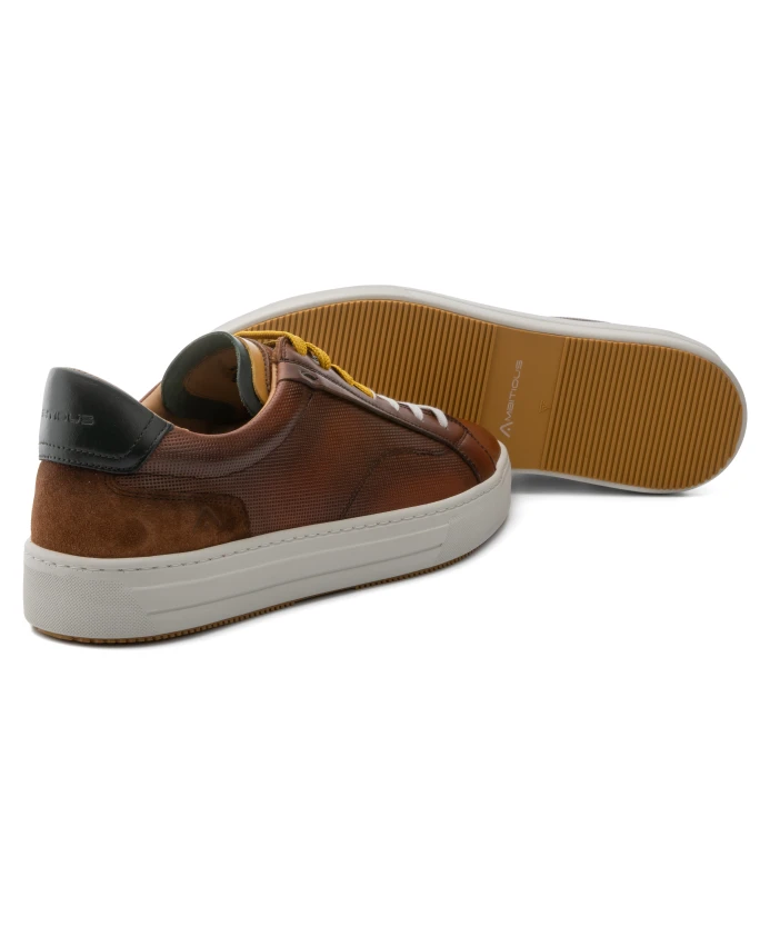 Кроссовки Ambitious на шнуровке отличаются минималистичным современным дизайном с перфорированным кожаным верхом и контрастными вставками, идеально подходящим для стильного, но в то же время повседневного образа. Ключевые особенности: цвет коньяк | коричневый | кожа | перфорированный кожаный верх | контрастные вставки | низкая подошва | размер и посадка: низкие кроссовки