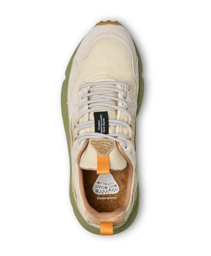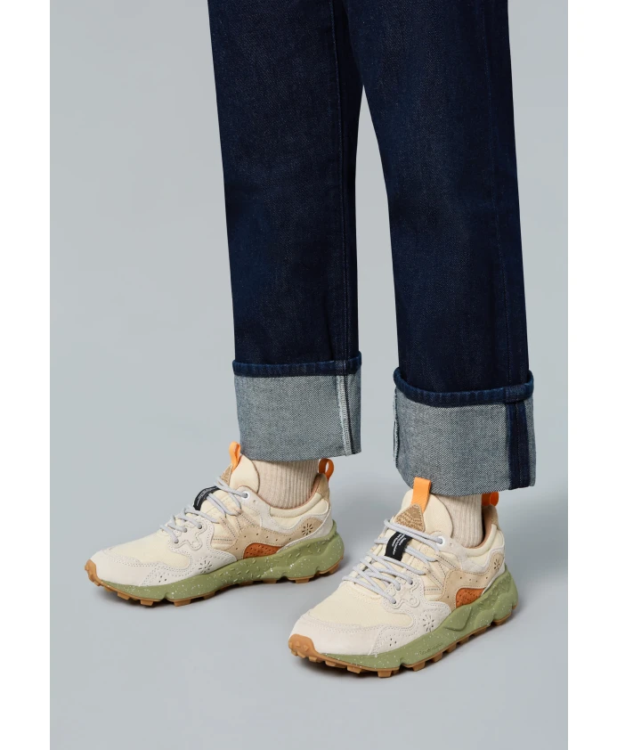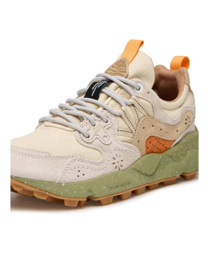 Спортивные кроссовки с верхом из хлопкового канваса и разноцветными замшевыми вставками. Застегиваются на трекинговые шнурки и имеют индивидуальную люверсу. Кожаная подкладка и антибактериальная стелька из натуральной пробки. Двухцветная резиновая подошва с зубчатым протектором. Обувь Flower Mountain обычно большемерит; рекомендуется заказывать на один размер меньше.
