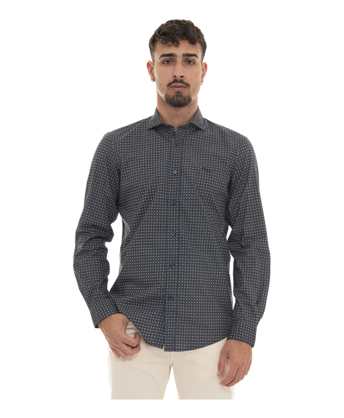 Рубашка Harmont & Blaine Casual сочетает в себе абстрактный узор и воротник-стойку, создавая универсальные образы в стиле smart-casual. Она украшена пуговицами с логотипом в тон, что придает образу изысканность и гармоничность. Ключевые особенности: Синий | Хлопок | Пуговица с логотипом | Абстрактный узор | Воротник-стойка | Логотип в тон | Состав и уход: 100% хлопок