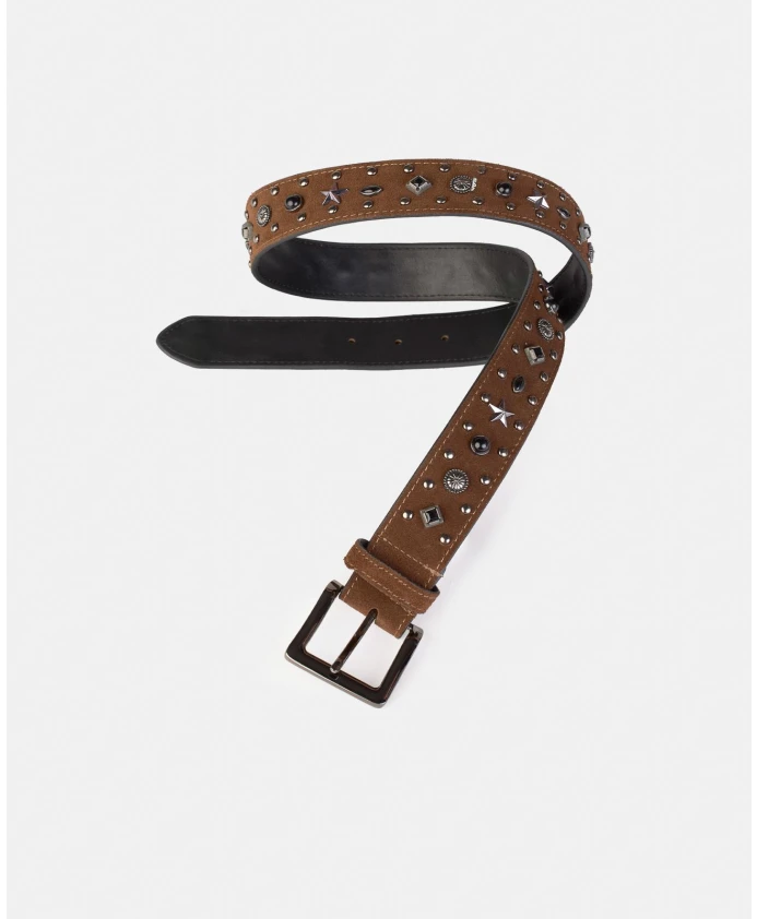 Ремень ALMA EN PENA с заклепками - это кожаный ремень шириной 4 см, украшенный заклепками и квадратной металлической пряжкой, который добавит изысканности и дерзости любому повседневному или вечернему образу. Основные характеристики: Коричневый | Кожа | Квадратная металлическая пряжка | Детали с заклепками | Размеры и посадка: Ширина: 4 см | Материал и уход: Кожа