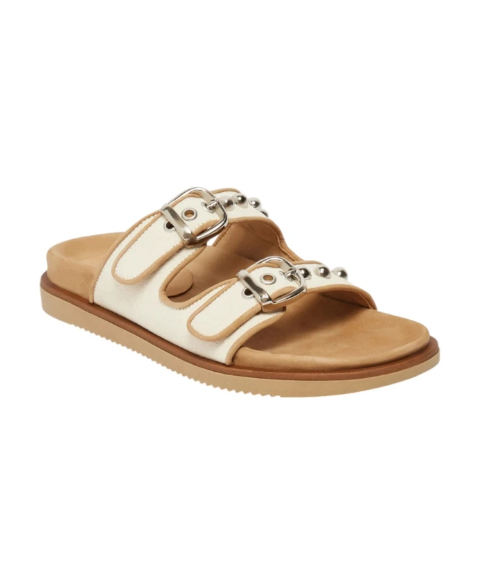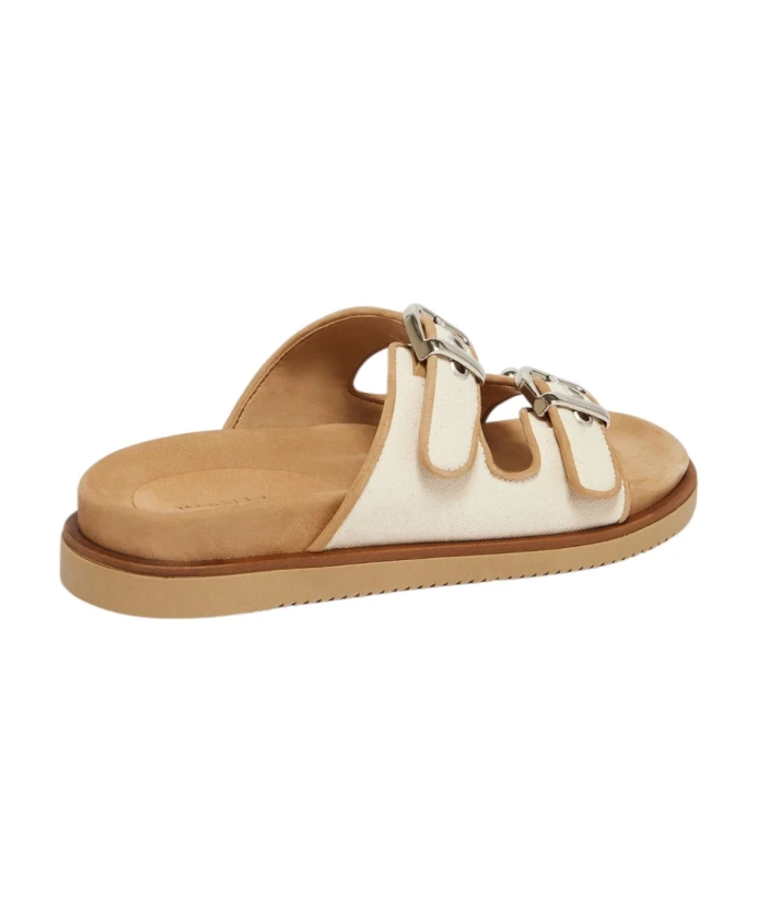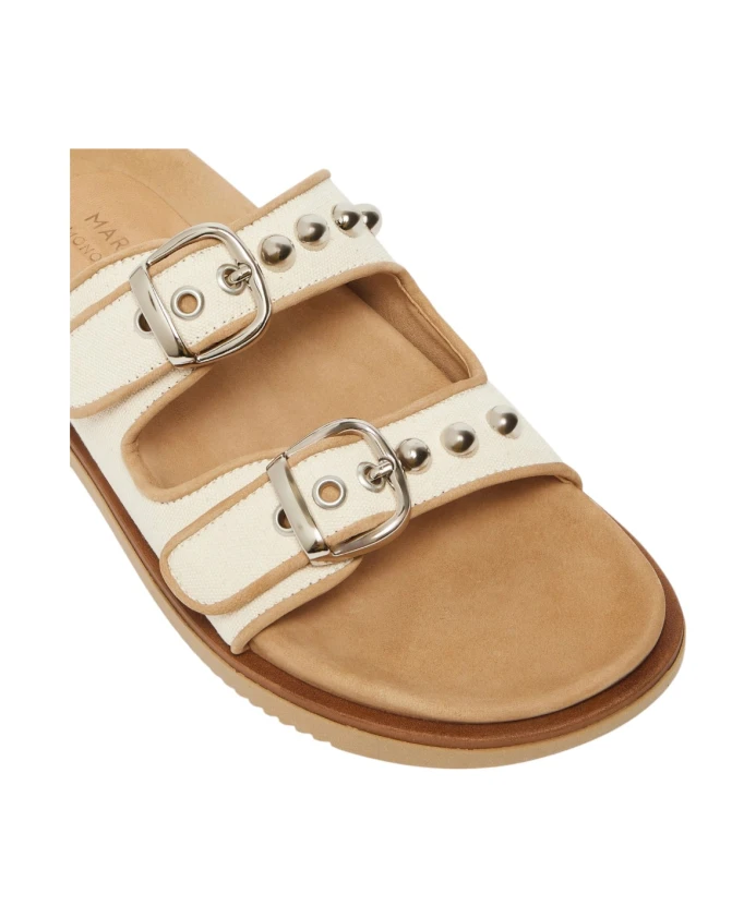 Женские шлепанцы Marella BEIGE с двойной пряжкой. Простые и элегантные, эти шлепанцы сочетают в себе повседневный стиль и женственные детали. Созданы в сотрудничестве с ACBC, ведущей компанией в области экологичной моды. Особенности: верхняя часть с двойной пряжкой и никелированными заклепками, регулируемые пряжки и резиновая подошва. Состав ткани: 100% хлопок.