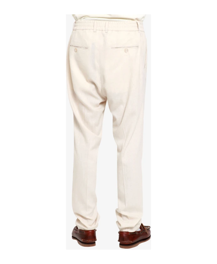 Подчеркните свой стиль с помощью этих зауженных брюк Cruna, изготовленных в Италии из льняной смеси. Они имеют частично эластичный пояс, потайной шнурок и зауженный крой для современного образа. Дополняют образ французские боковые карманы, прорезные карманы на пуговицах и фирменный логотип Cruna, вышитый сбоку. Идеальный вариант для мужчины, следящего за модой.