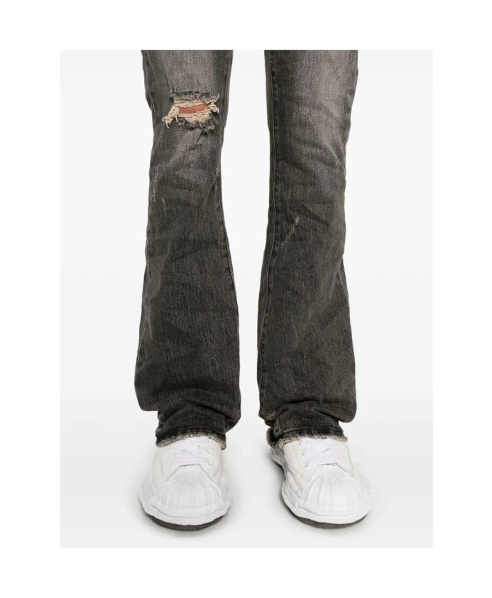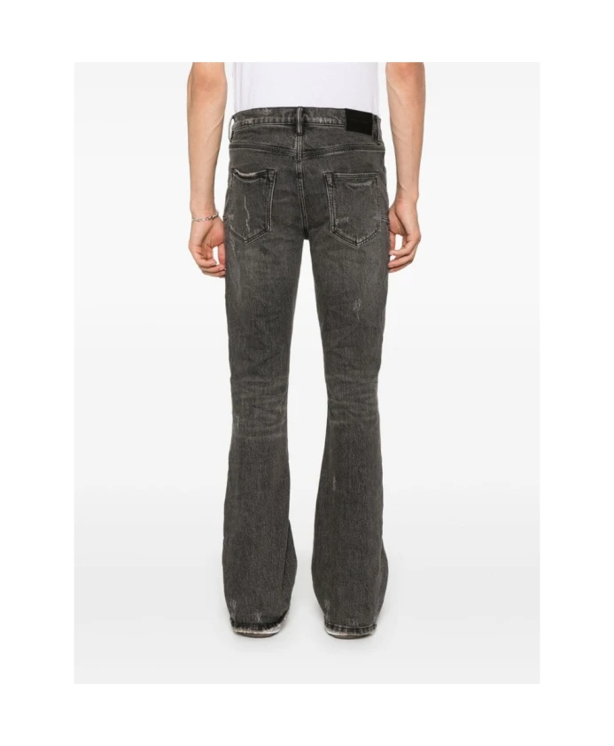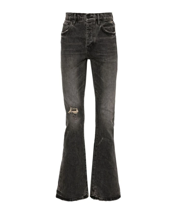 Подчеркните свой стиль с помощью этих черных расклешенных джинсов от Purple Brand. Изготовленные из хлопкового денима с покрытием, эти джинсы имеют эффект потертости и рваные детали, придающие им брутальный вид. Модель имеет расклешенный крой, петли для ремня, пять классических карманов, нашивку с логотипом сзади и потайную застежку на молнию и пуговицу.