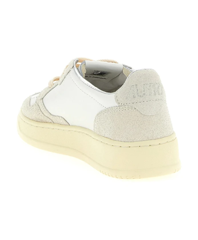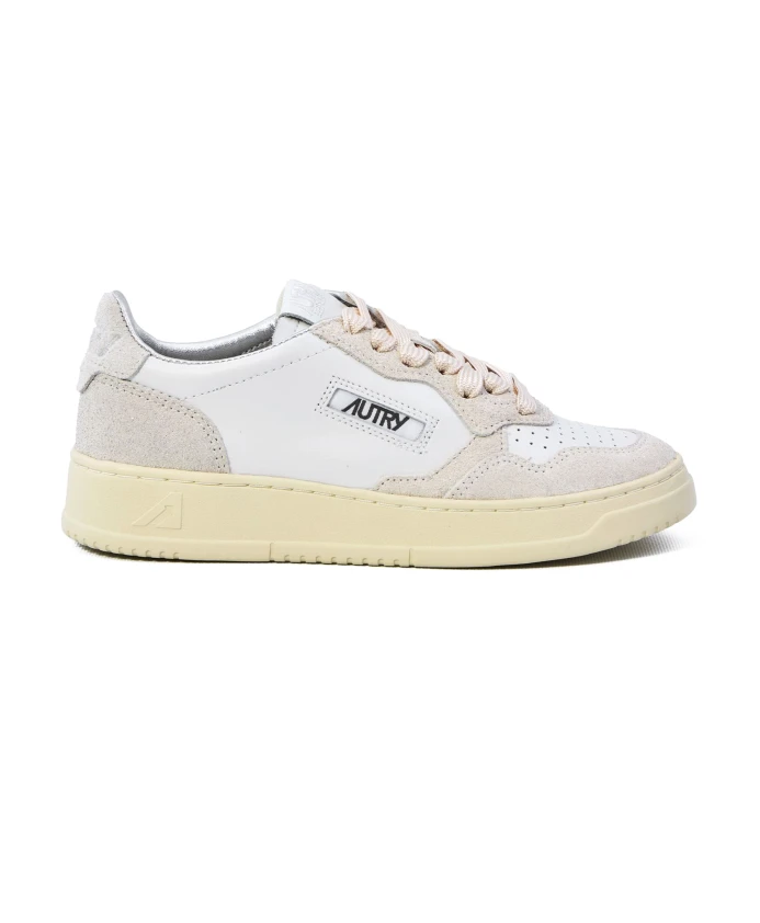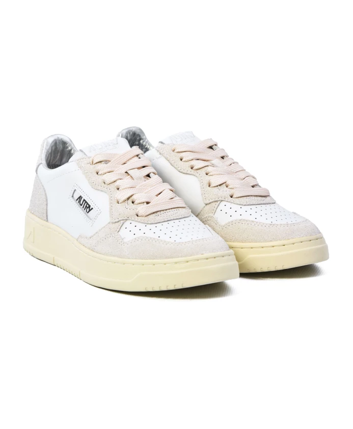 Низкие кроссовки Autry Medalist белого цвета из кожи и замши для женщин. Особенности: микроперфорированный носок, плоские хлопковые шнурки, вышитая этикетка на язычке, мягкий воротник, подкладка из свиной кожи, махровой ткани и нейлона, кожаная стелька высотой 2 см и резиновая подошва высотой 2,5-3,5 см. В комплекте фирменный тканевый мешок для обуви.