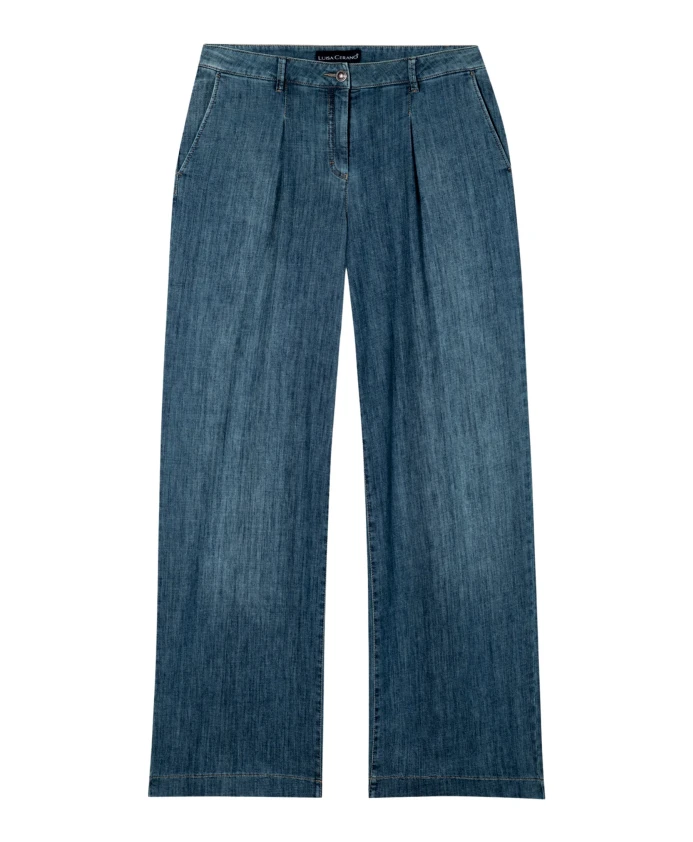 Подчеркните свой стиль с помощью этих широких брюк Luisa Cerano из легкого, струящегося денима с эффектом отбеливания. Они имеют свободный крой, складки на поясе и четыре кармана. Наша модель ростом 178 см и носит размер 36. Состав: 90% хлопок, 8% эластомультиэстер и 2% эластан. Машинная стирка. Имеются петли для ремня, застежка на пуговицу и молнию.