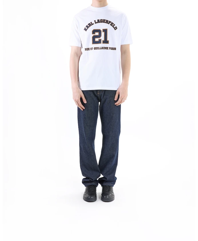 Футболка № 21 белого цвета. Хлопковая футболка с короткими рукавами от Karl Lagerfeld, отличительной чертой которой является принт логотипа на передней части, отсылающий к культовому адресу Дома моды Karl Lagerfeld в Париже. Короткие рукава. Круглый вырез. Принт логотипа и адреса Дома моды на передней части. Свободный крой. Цвет: белый. 100% хлопок.