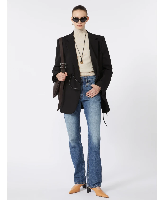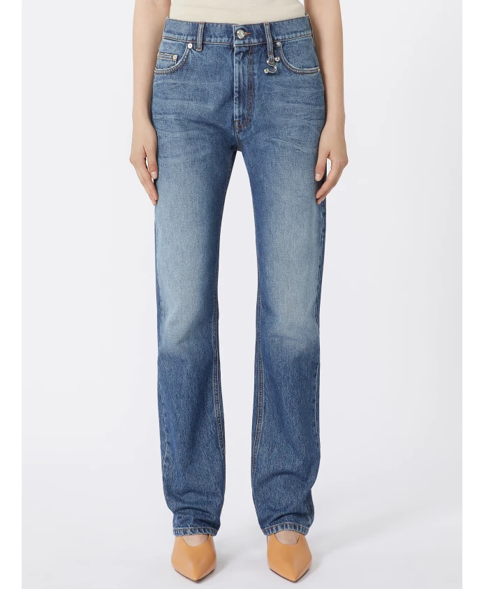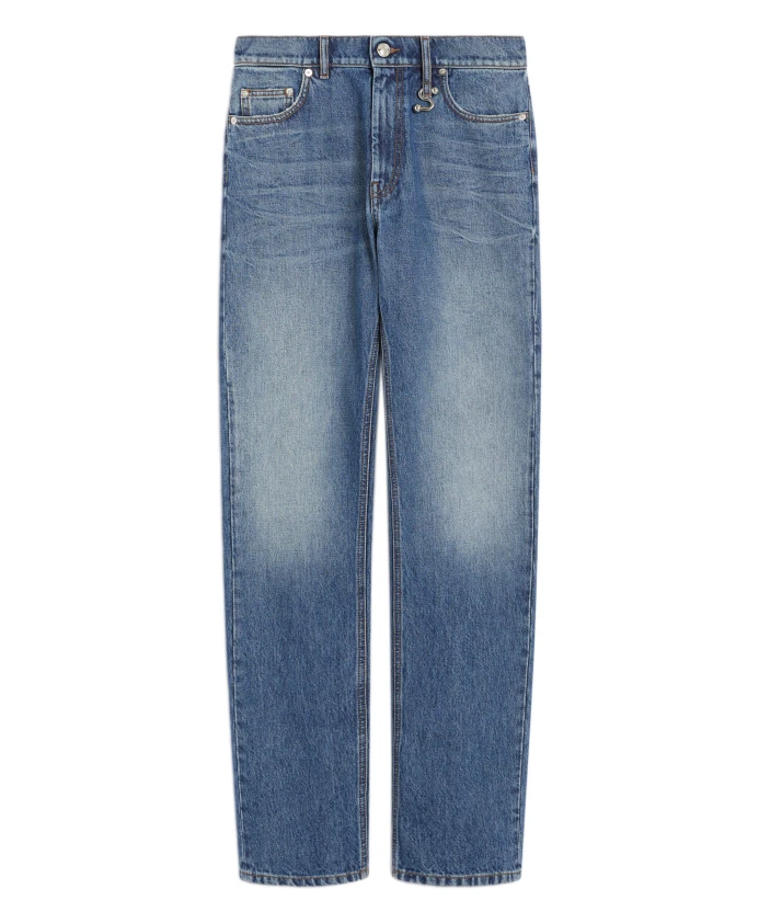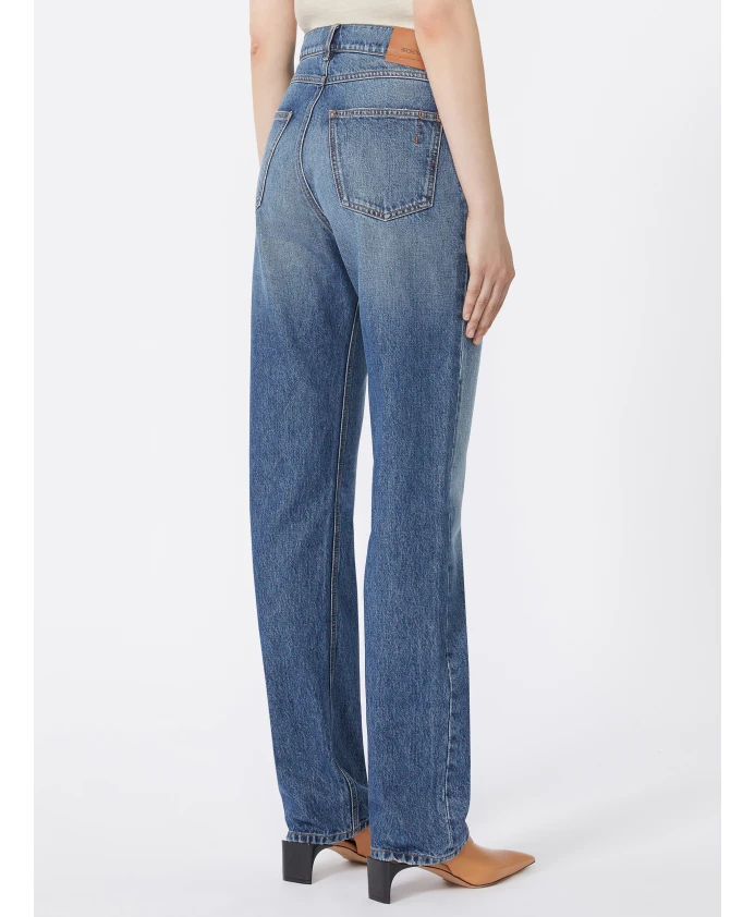 Джинсы Sportmax прямого кроя из натурального индигового денима со средней степенью винтажной обработки. Стандартный крой, низкая посадка, прямые штанины. Пять карманов, фирменная застежка на пуговицах, металлические заклепки и этикетка сзади. Контрастная строчка табачной нитью и деталь в виде держателя для ручки сзади. Изготовлены из 100% хлопка.