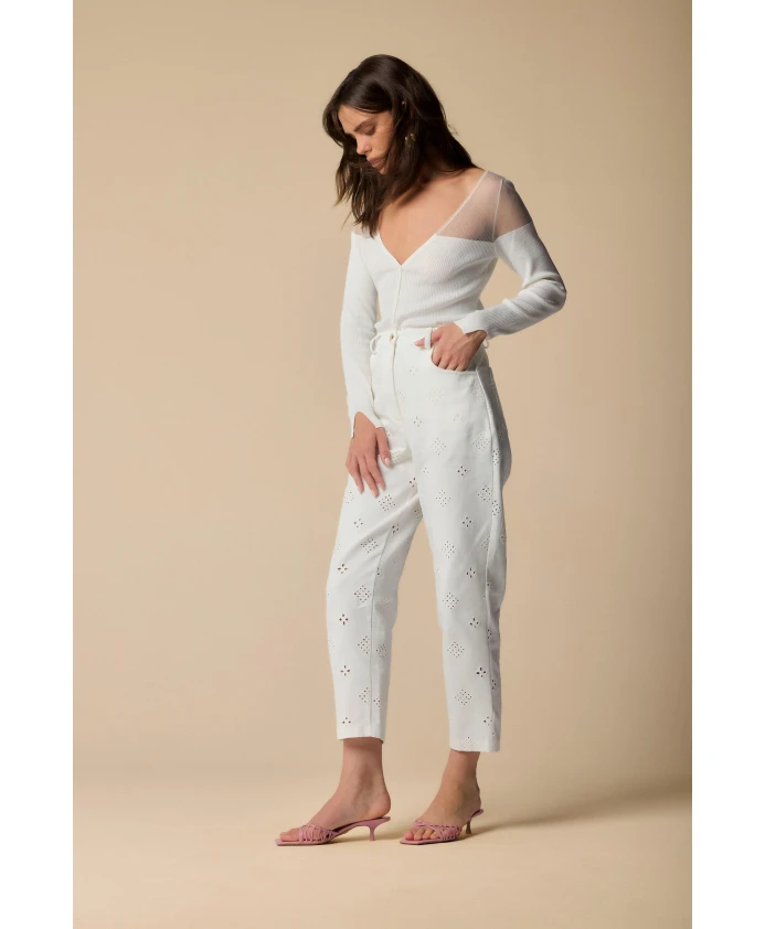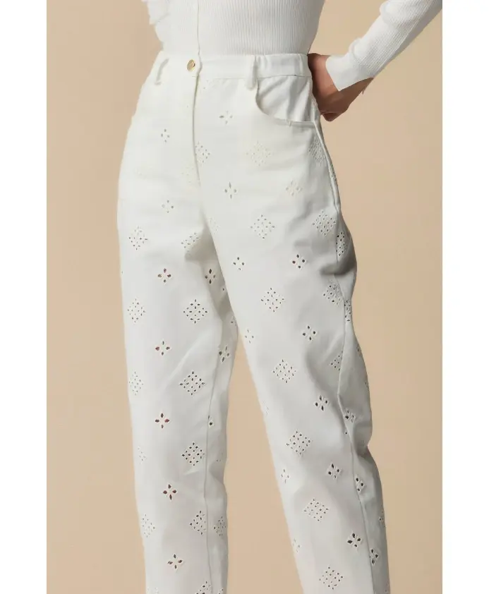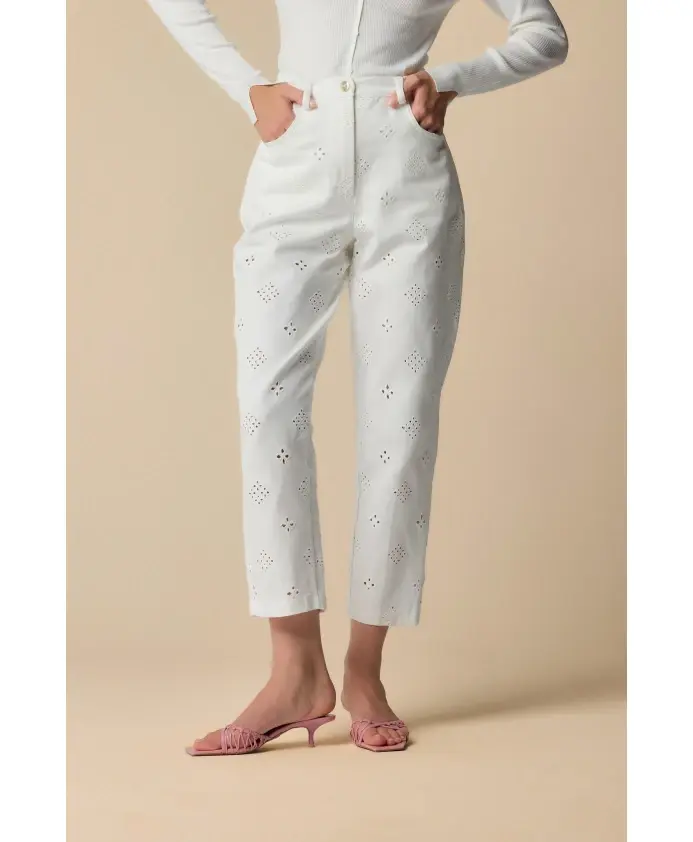 Откройте для себя элегантность с укороченными кружевными брюками Kocca, украшенными изысканным кружевом Sangallo, идеально подходящими для создания шикарного образа. Ключевые особенности: Белый цвет | Кружево Sangallo | Застежка на молнию и пуговицу | Передние и задние карманы | Прямой крой | Высокая талия | Размеры и посадка: Укороченный крой