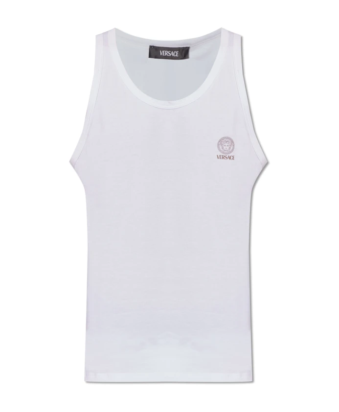 Майка Medusa от Versace - стильное дополнение к вашему гардеробу, украшенное эффектным изображением Медузы на груди. Идеально подходит для многослойных образов или ношения отдельно, эта майка сочетает в себе комфорт и культовый дизайн. Ключевые особенности: Белый | Хлопок | Круглый вырез | Без рукавов | Зеленый логотип | Состав и уход: Хлопок