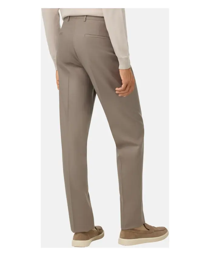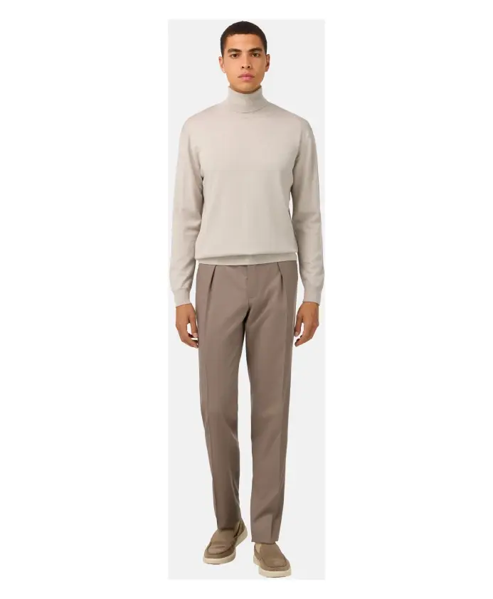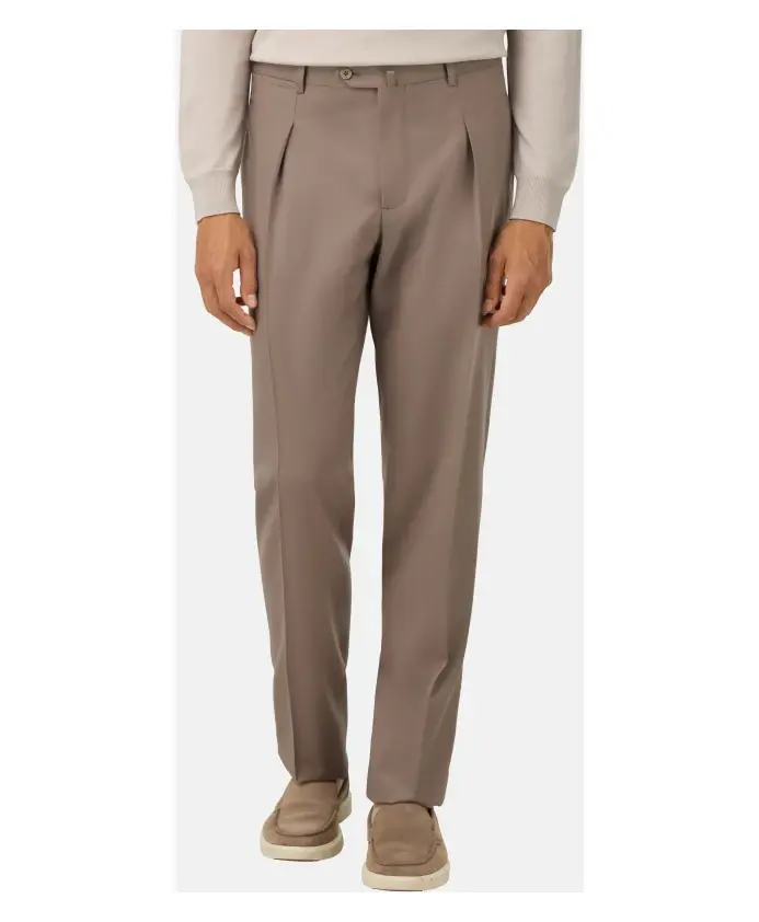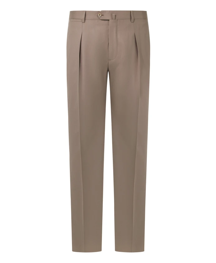 Фланелевые брюки. Изделие имеет складки с каждой стороны, застежку на молнию и пуговицу, передние карманы, вшитые в боковые швы, и задние карманы. Ткань из 100% шерсти сертифицирована в соответствии с важнейшими международными стандартами, гарантирующими благополучие животных, надлежащее управление фермой и полную отслеживаемость сырья.