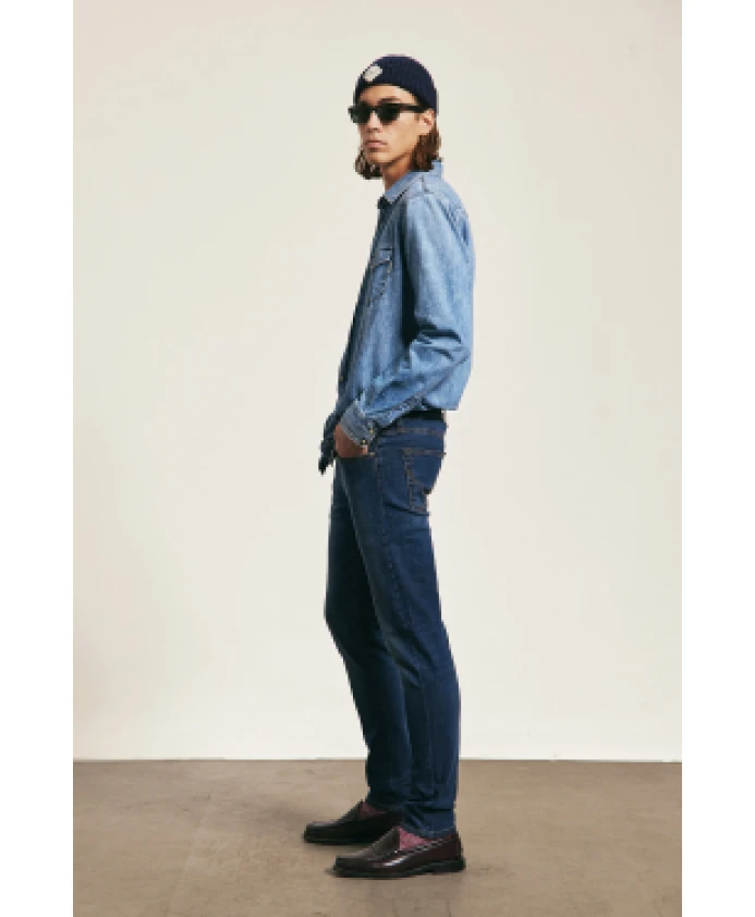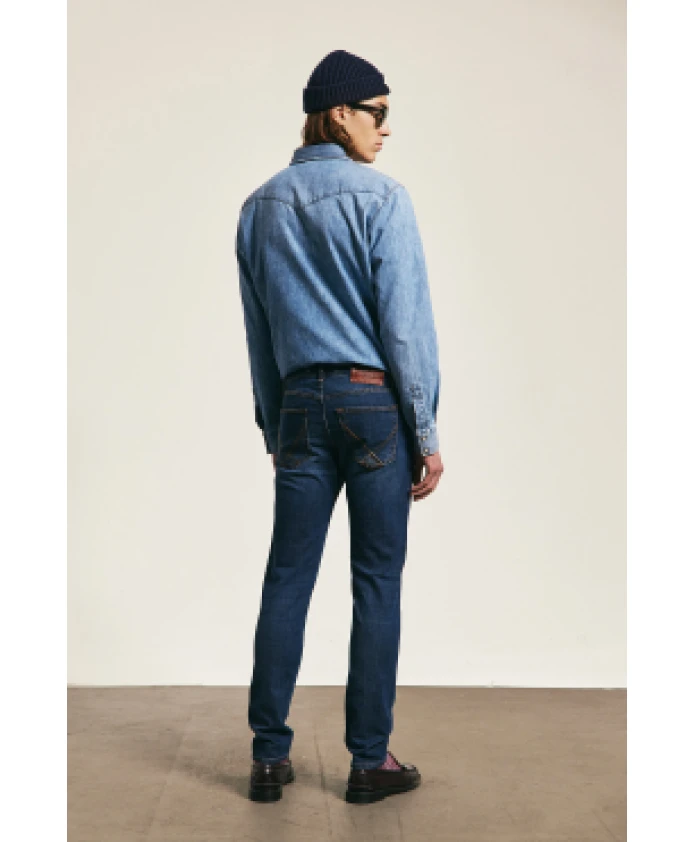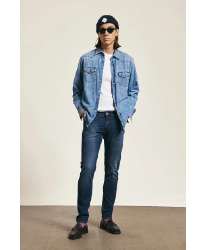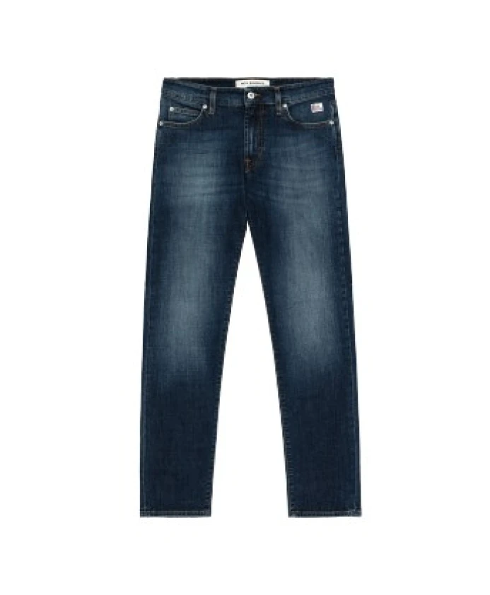 Откройте для себя мужские прямые джинсы от Roy Roger's в темном джинсовом цвете. Они имеют среднюю посадку на талии, петли для ремня и кожаную нашивку с логотипом сзади. Застежка спереди на пуговицу с логотипом и молнию. Два передних и два задних кармана украшены этикеткой Roy Roger's. Зауженный крой придает им современный вид.